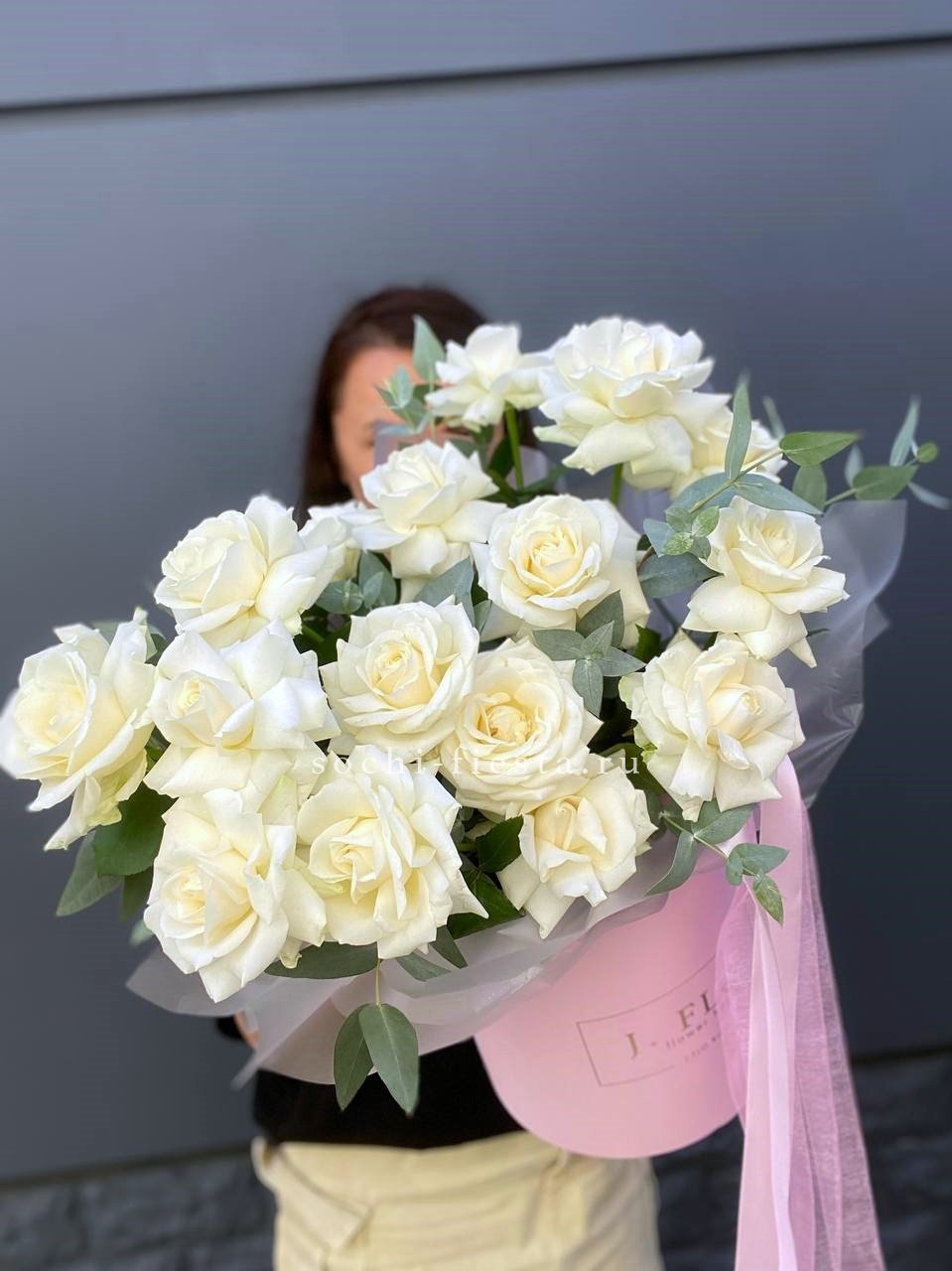 101 белая роза, лента, упаковка на выбор.