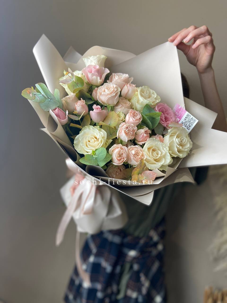 Пышная композиция из одноголовых и кустовых роз в дизайнерской пленке. Эвкалипт добавляет графичности, а лента завершает образ.