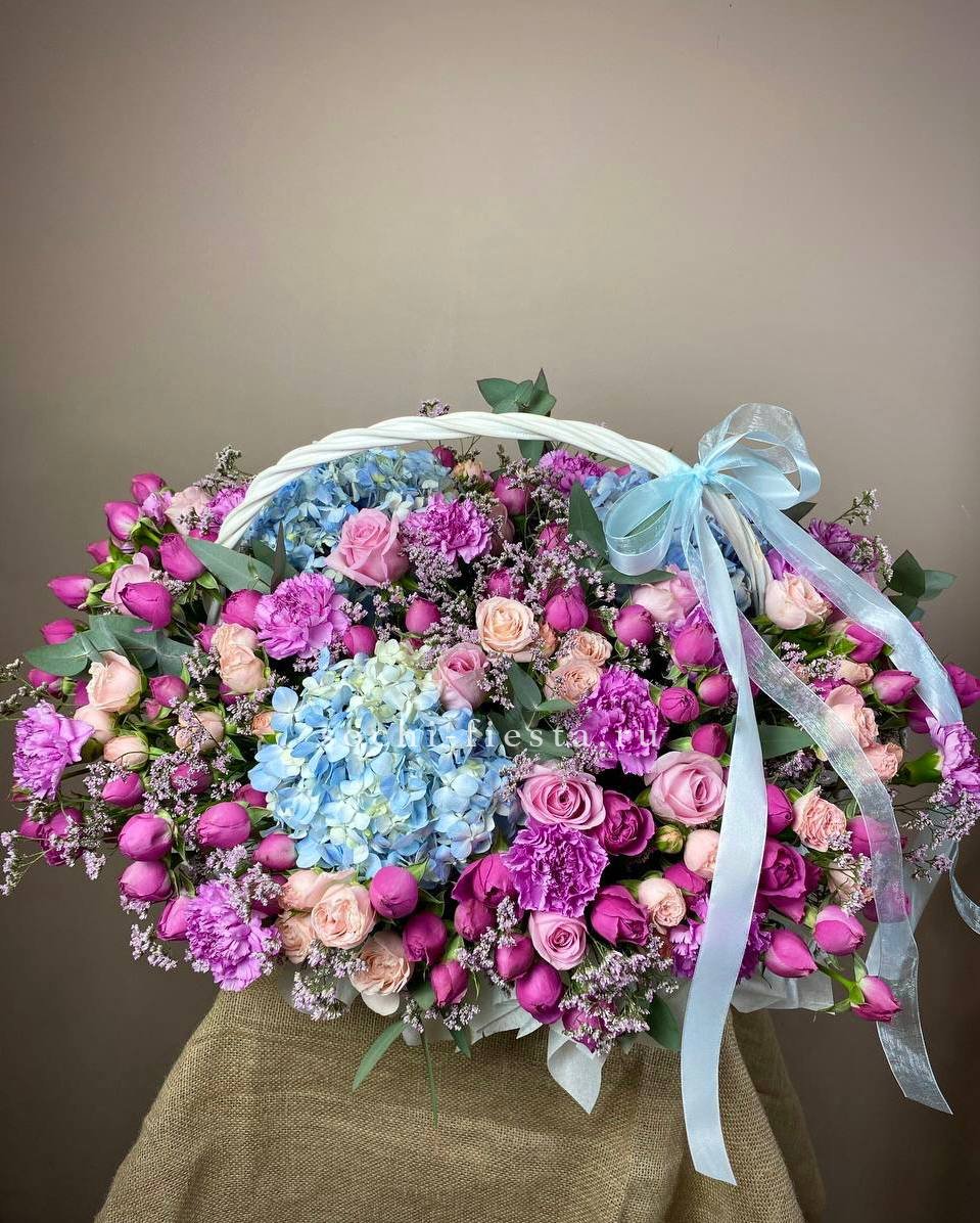 Корзина в лавандовых тонах объединяет пышные соцветия гортензии, кустовые и классические розы с воздушным лимониумом. Эвкалипт добавляет графику и свежесть всей композиции.