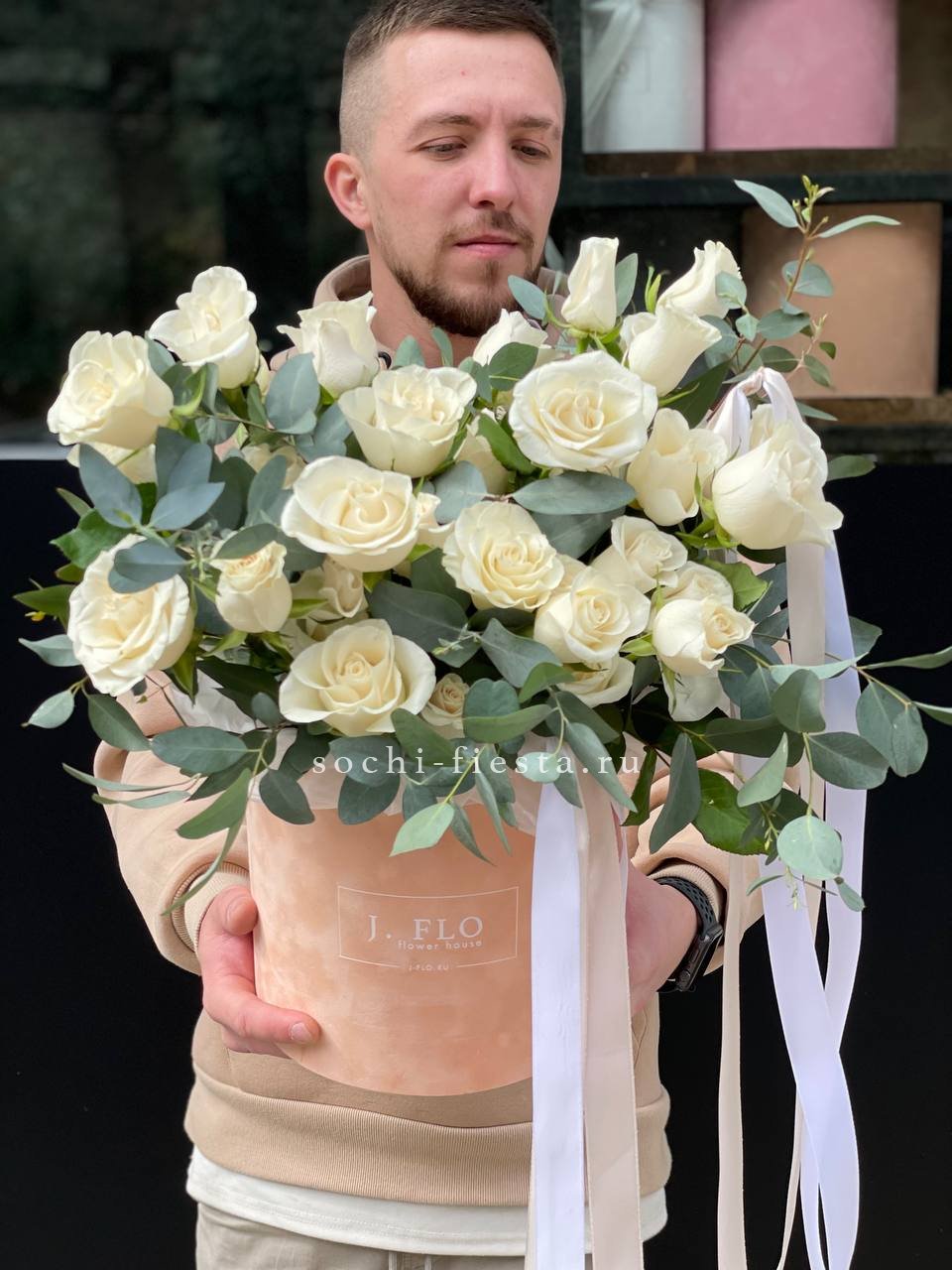 гортензия, эустомы, кустовые розы, одноголовая роза, эвкалипт, вспомогательные цветы (зависит от сезона), тишью, лента, авторская упаковка.