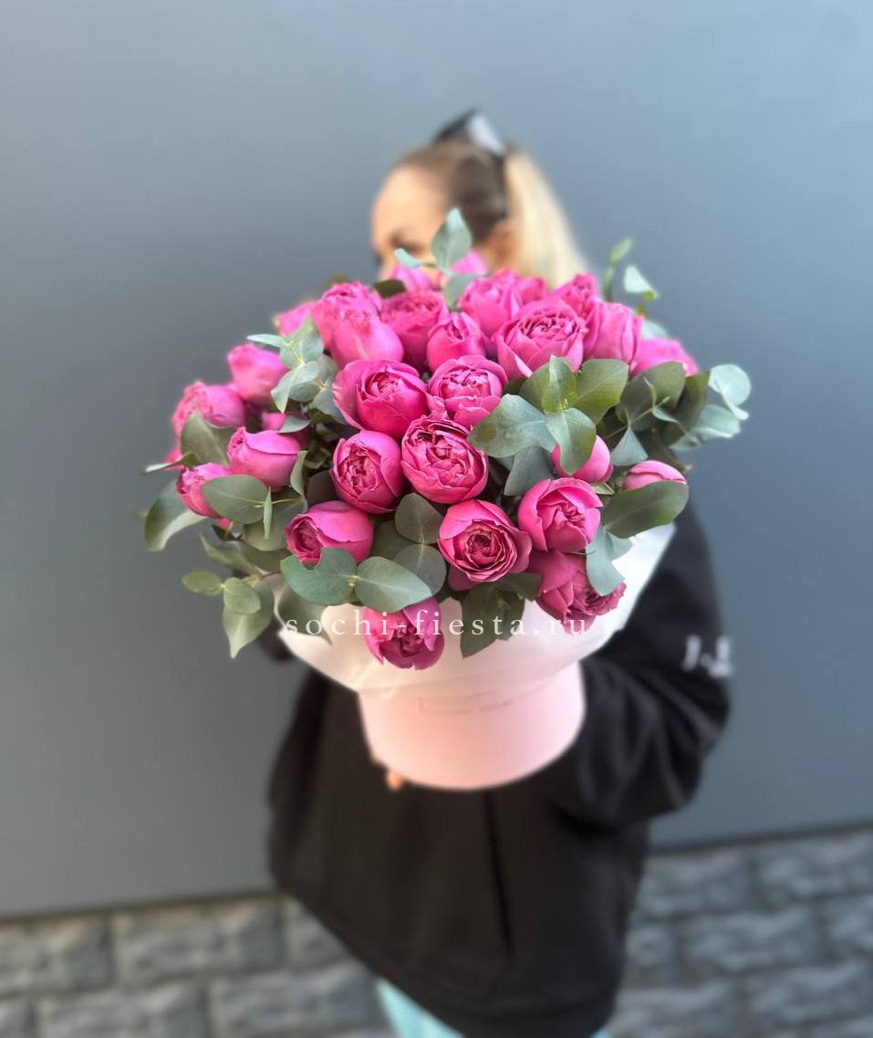 эустома, розы, кустовые розы, диантусы, эустома, озотамнус, макаронс- 6шт., коробка.