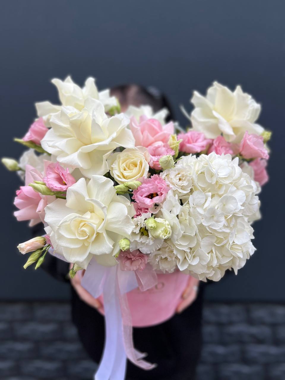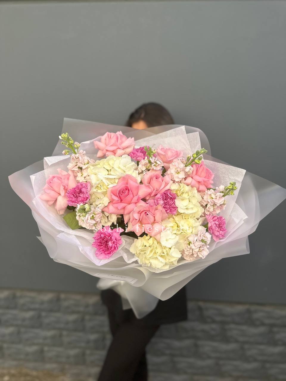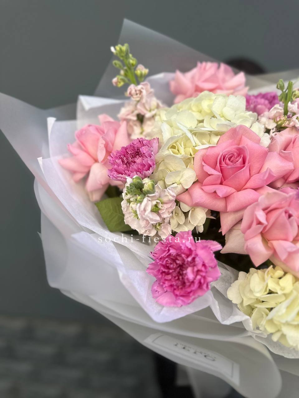 маттиола, розовые розы, гортензии, диантусы, лента и дизайнерская пленка.