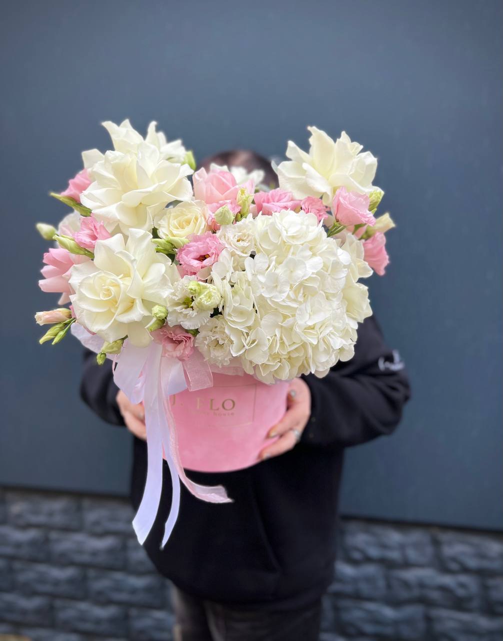 Маттиола раскрывается пышными кистями и задаёт тон всей композиции. Гортензия образует объёмную базу, а розы распределены так, что взгляд скользит от одного бутона к другому.