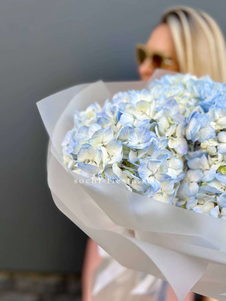 Три пышных шапки голубой гортензии образуют округлую форму с естественной асимметрией. Каждое соцветие раскрыто полностью, создавая впечатление объёмного облака в руках.