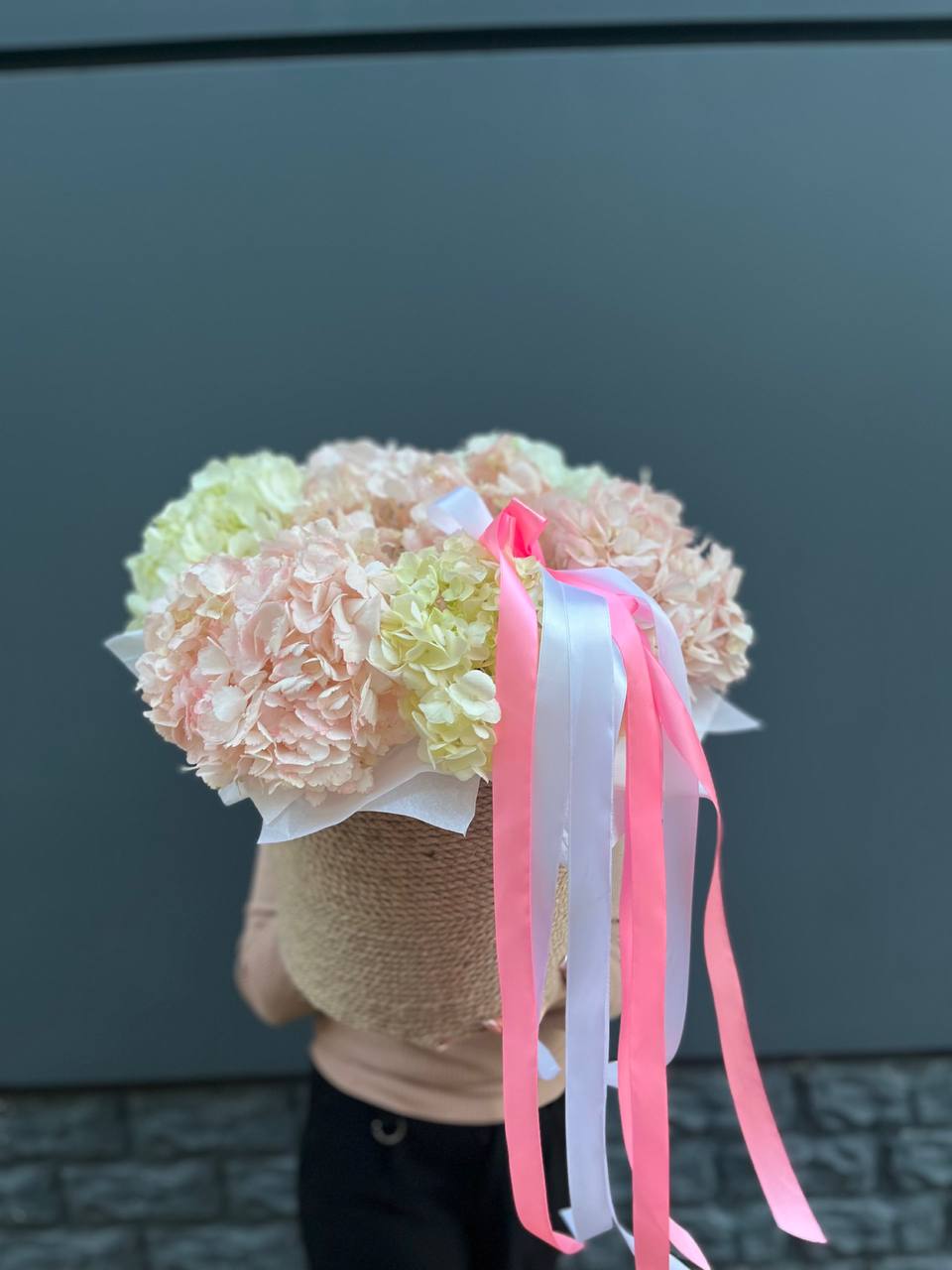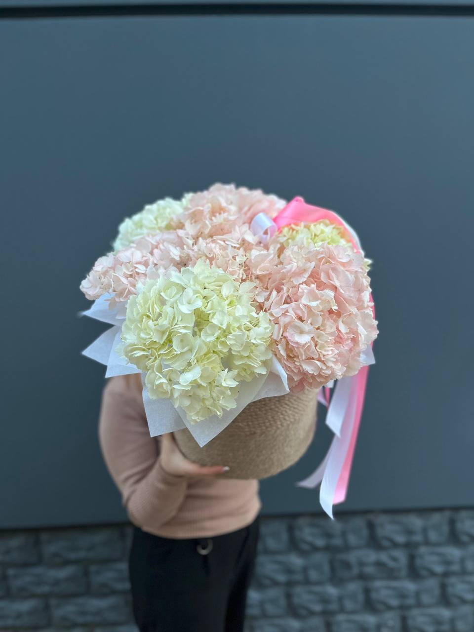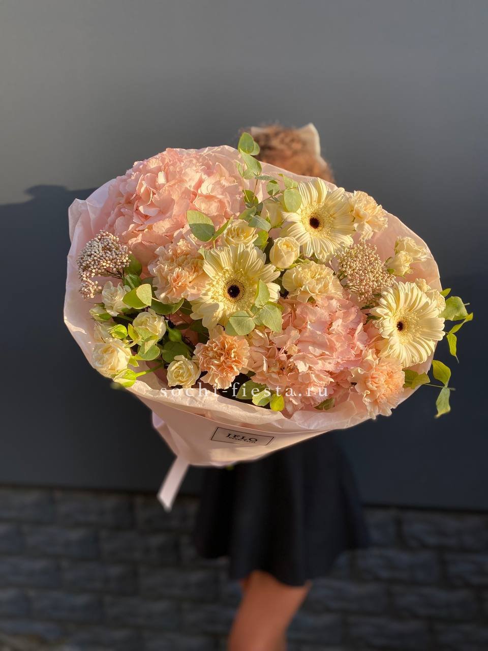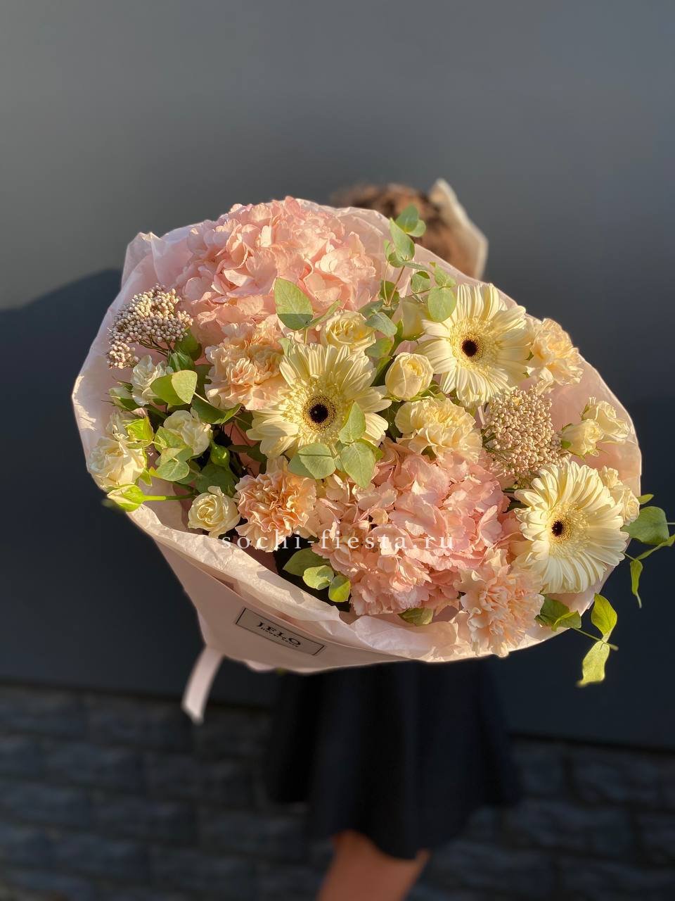 Мисти Баблс и гортензии в воздушной упаковке дарят ощущение свежести раннего утра. Лёгкая структура букета сохраняет форму и долго радует глаз.