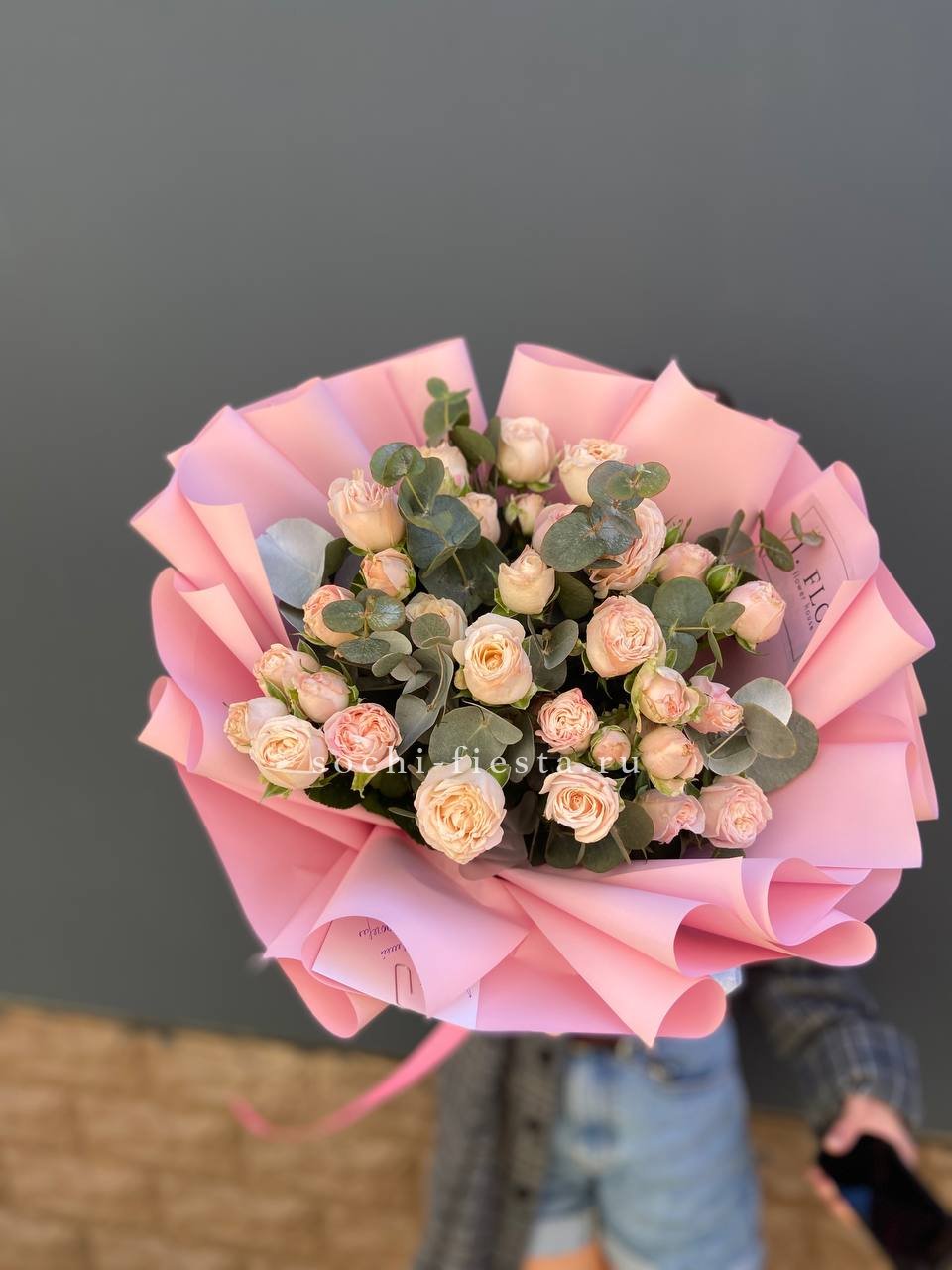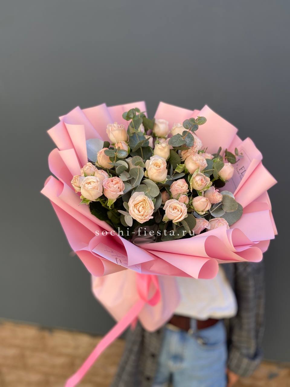 эустома, розовые пионы Сара Бернар, пионовидные розы, дельфиниум (замена вне сезона), тюльпан (замена вне сезона), лента, дизайнерская упаковка.