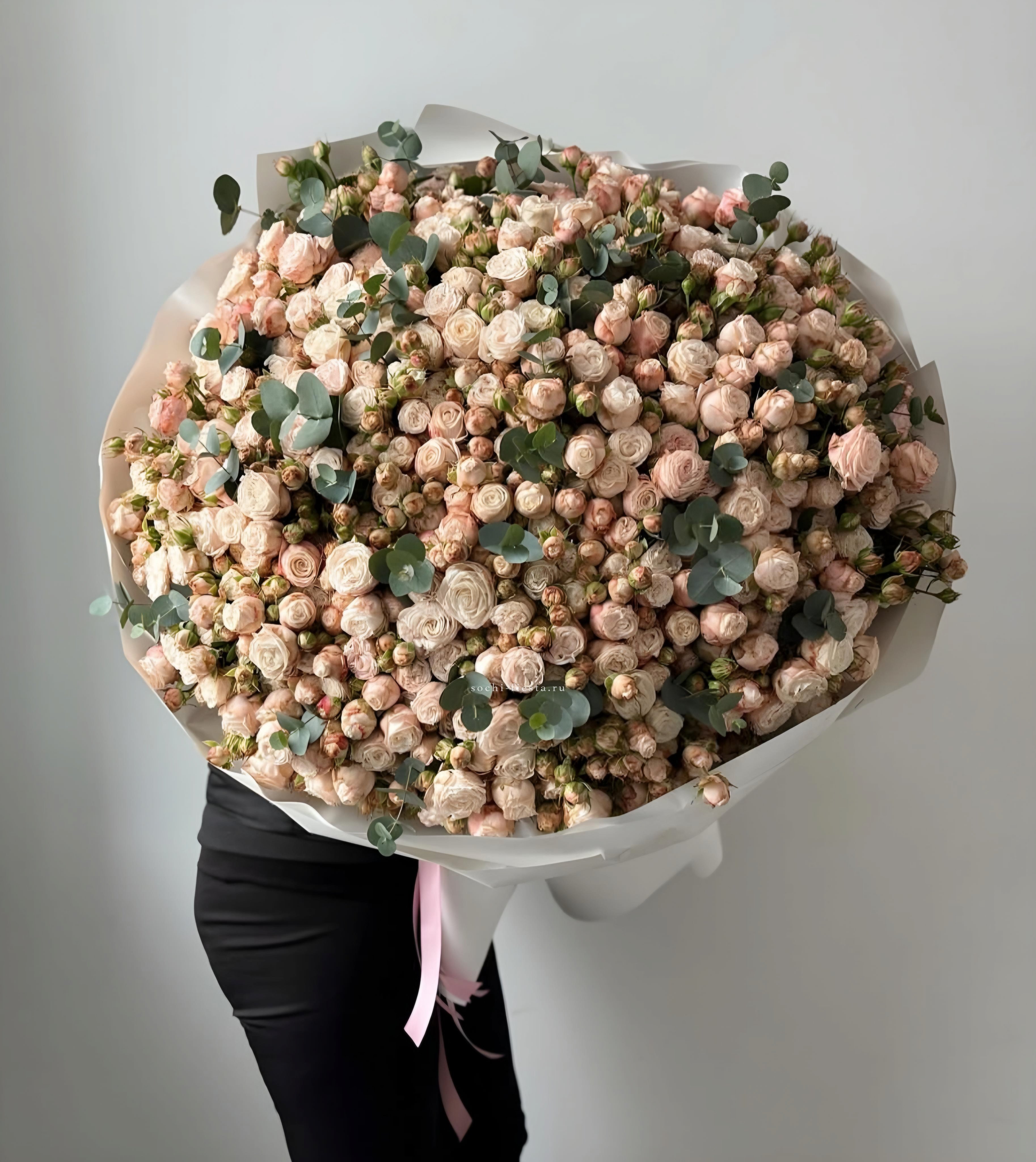 эустома, розовые пионы Сара Бернар, гортензия, розы одноголовые, эвкалипт, лента, дизайнерская упаковка.