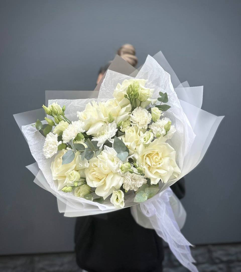белые розы, диантус, хризантема кустовая, эустома, эвкалипт, лента, авторское оформление.