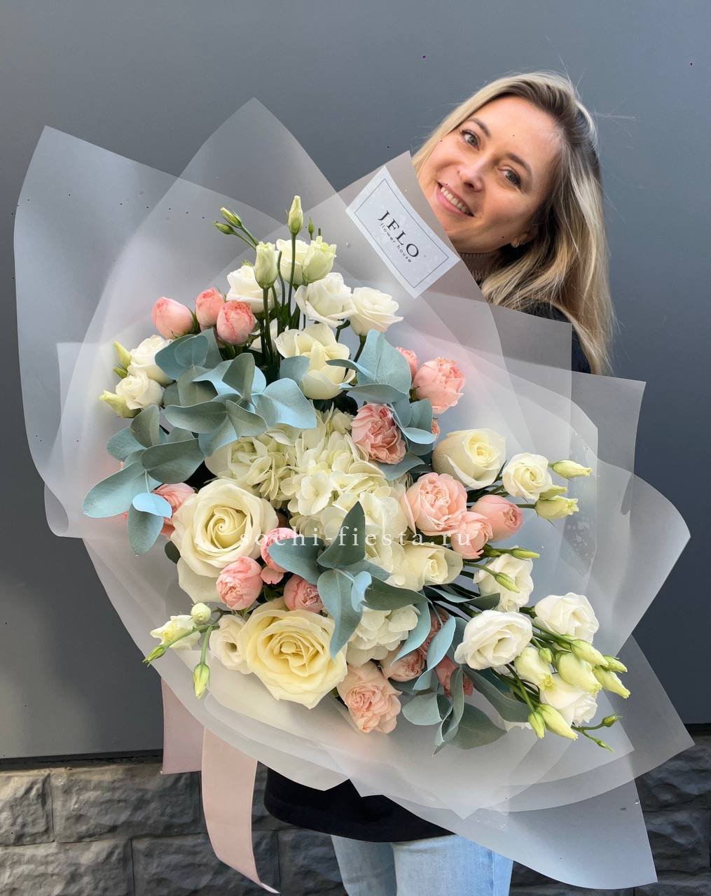 розы, гортензия, эустома, эвкалипт, дизайнерская упаковка.