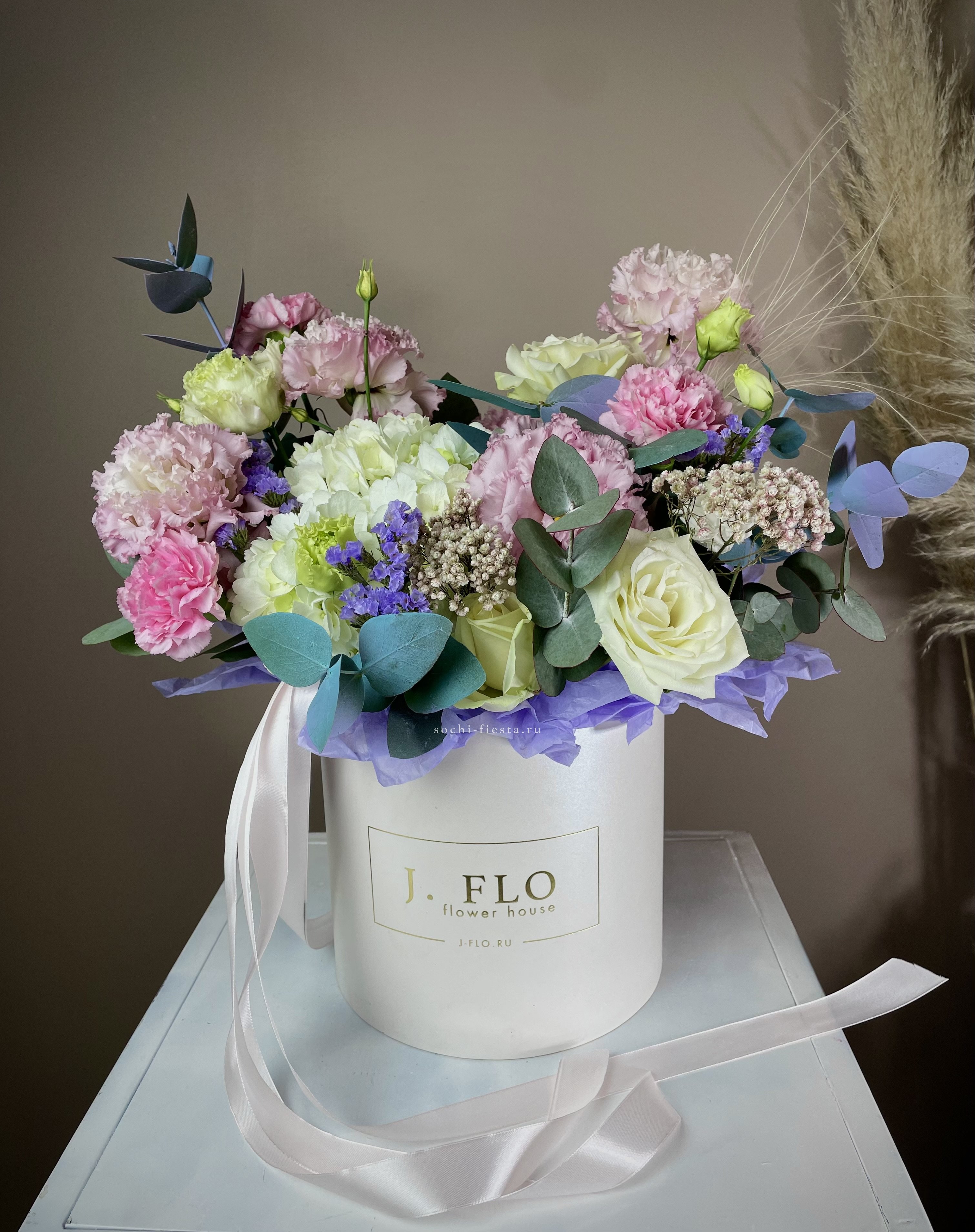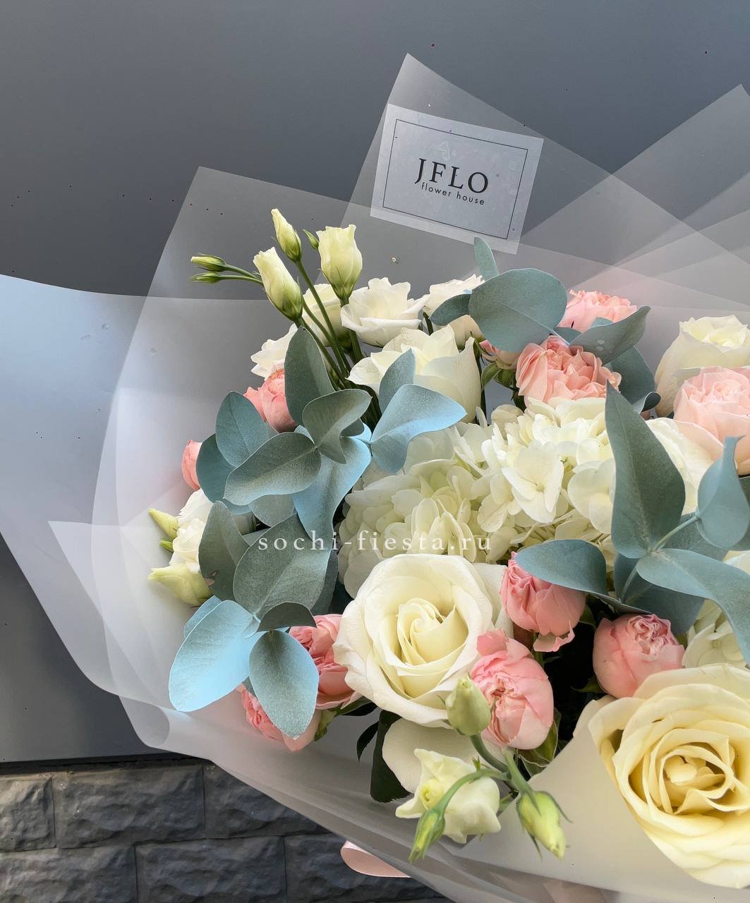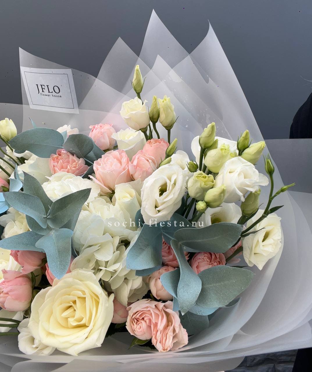 Розы и гортензия формируют объемную текстуру, где каждый бутон раскрыт по-своему. Эустома заполняет пространство между крупными соцветиями, а эвкалипт обрамляет композицию мягкой зеленой волной.