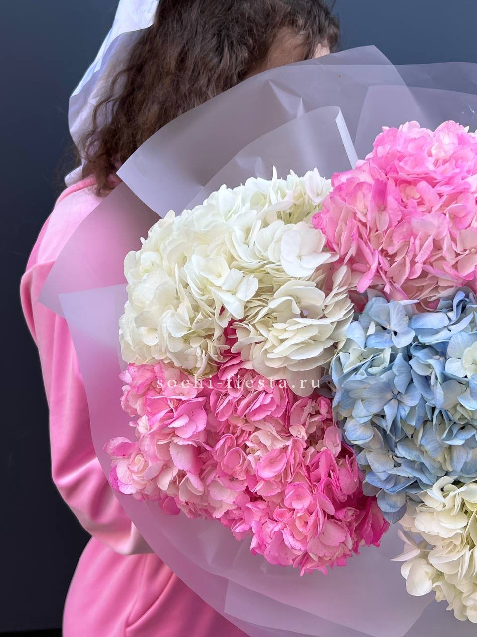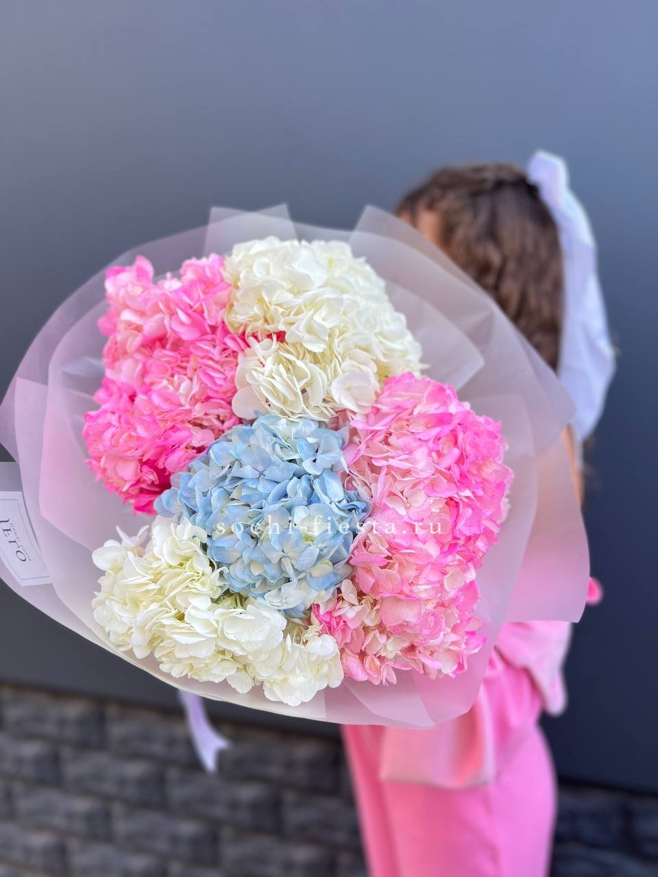 Розовая гортензия и эустома раскрывают свою красоту в каждом лепестке. Мягкие оттенки переходят один в другой, создавая спокойное и гармоничное впечатление.