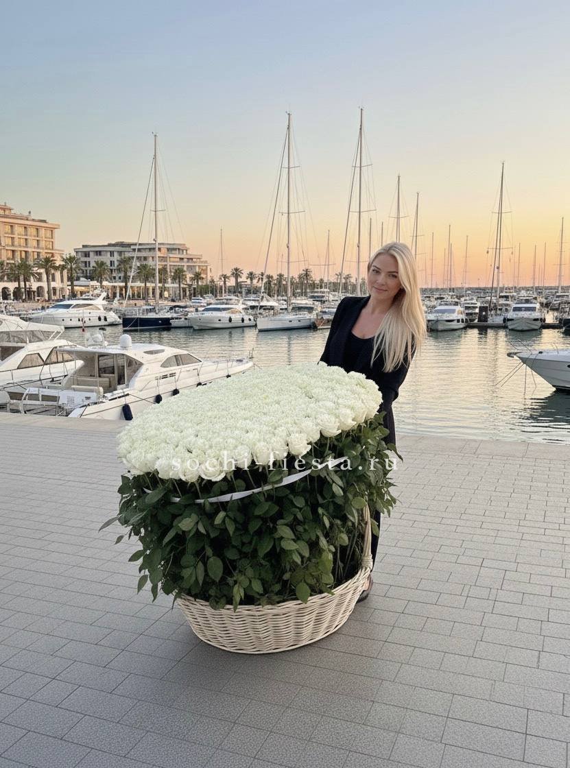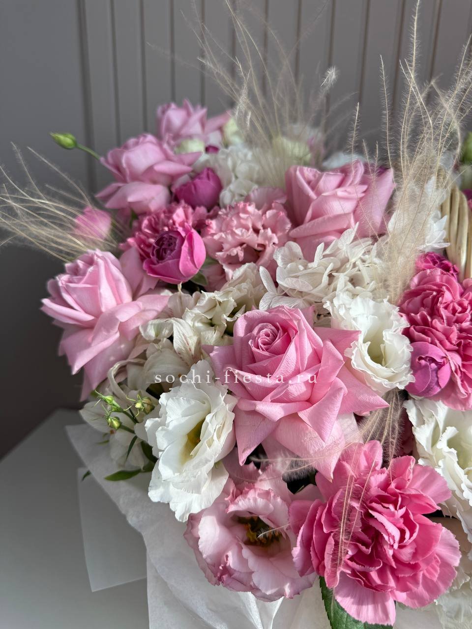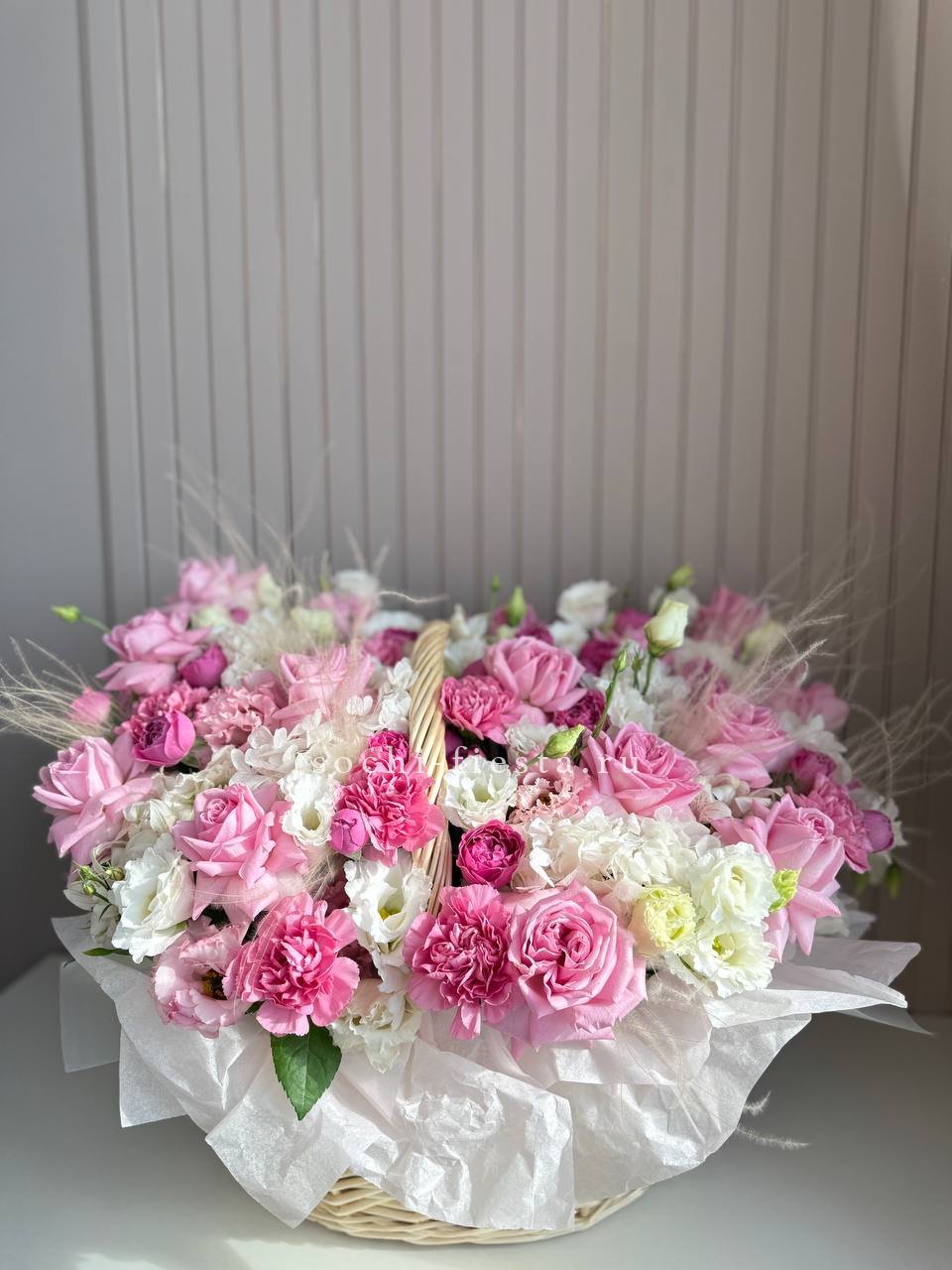 роза белого и розового оттенка 555 шт., оформление в каркас или корзину.