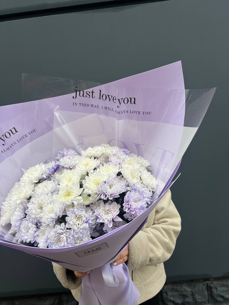 Девять пышных хризантем с переходом от сиреневого к белому собраны в аккуратную композицию. Лавандовая упаковка дополняет холодную гамму и создаёт цельное впечатление. Букет хорошо держит форму и подходит для размещения в высокой вазе.