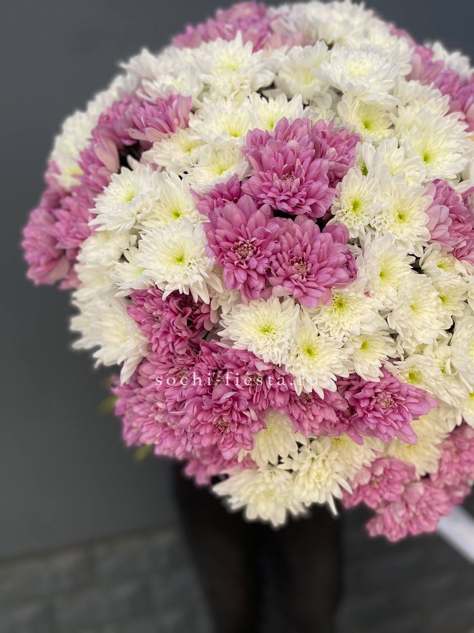 Двадцать пять кустовых хризантем раскрываются густыми шапками разных оттенков. Плотные многослойные бутоны формируют пышный букет с яркой игрой цвета и природной свежестью.