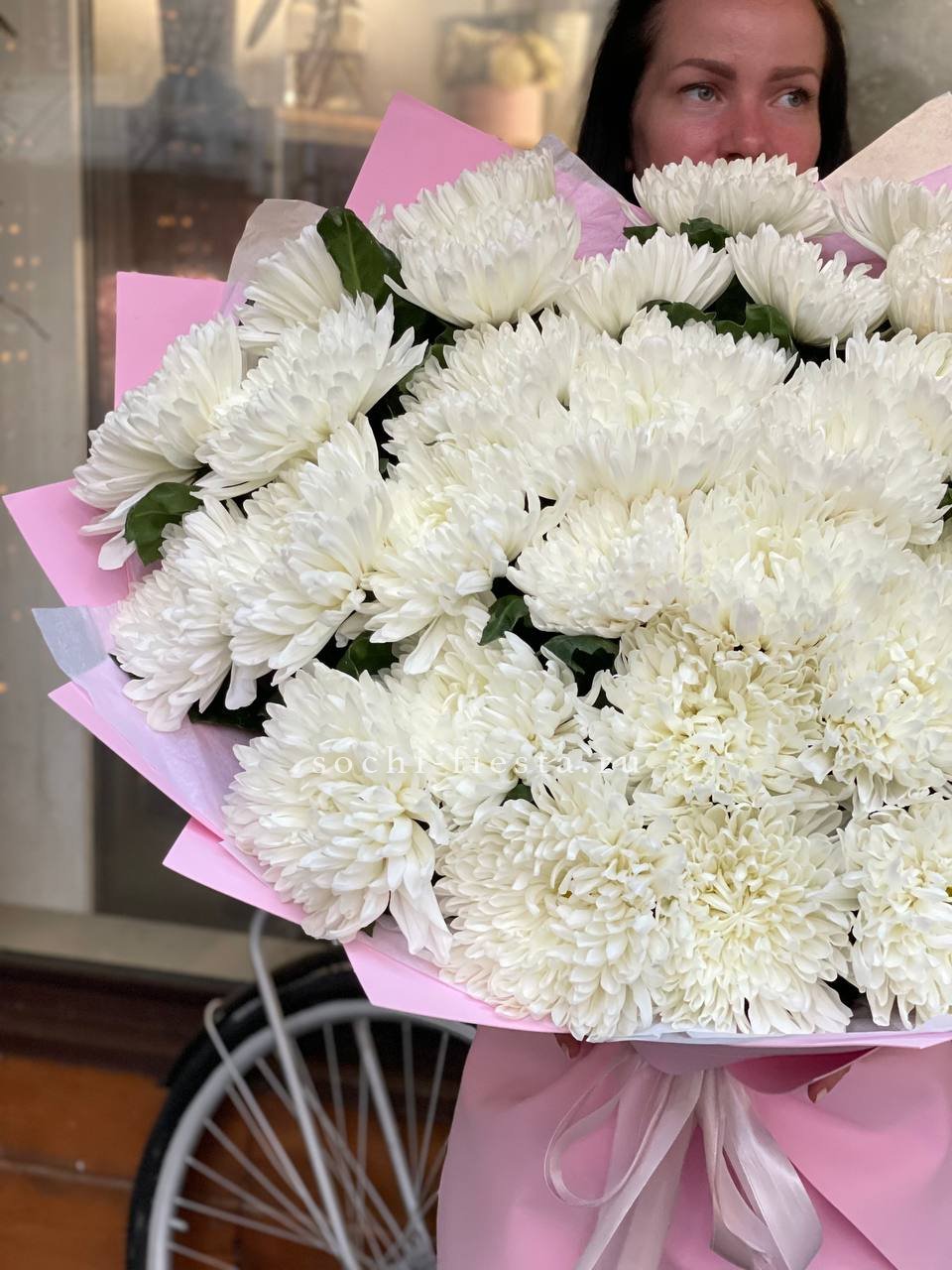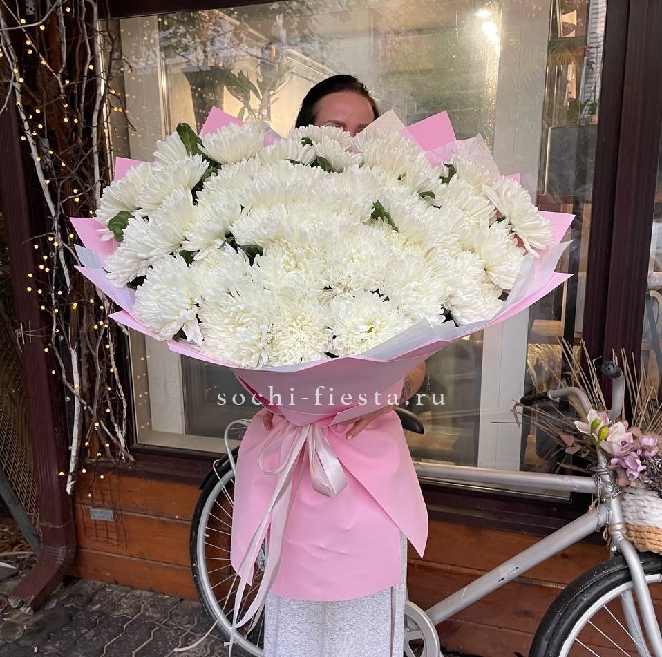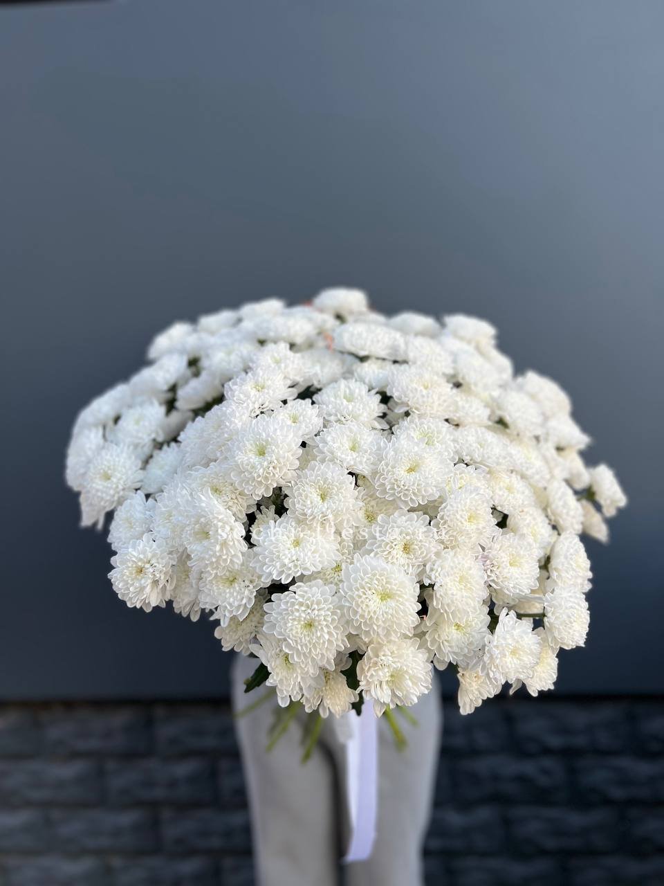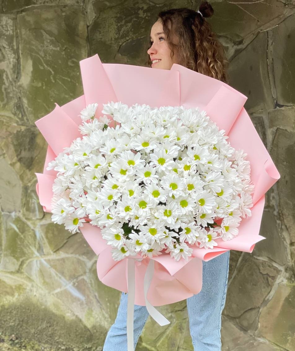 Девять кустовых хризантем собраны в плотный круглый силуэт. Каждая ветка раскрывается веером мелких соцветий, создавая объёмную текстуру. Букет держит форму и выглядит графично.
