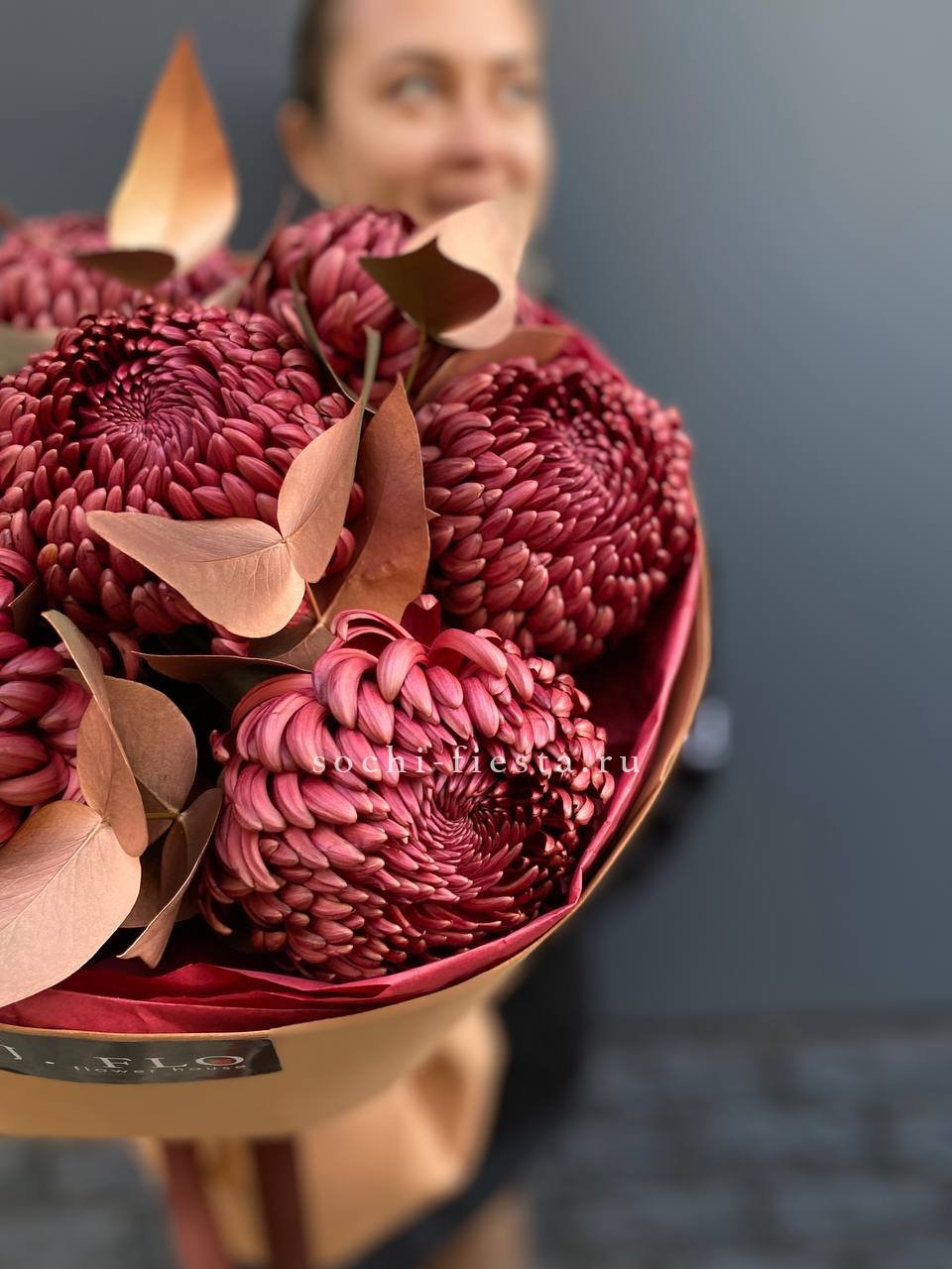 Теплый шоколадно-золотой оттенок хризантем создает уютное осеннее настроение. Семь пышных соцветий собраны в компактную композицию с веточками эвкалипта.