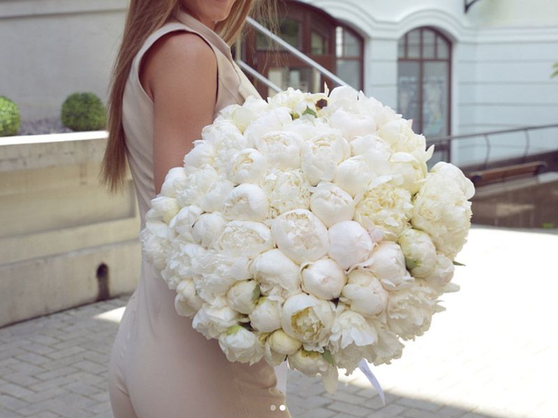 Пятьдесят один белоснежный бутон собран в монохромную композицию внушительного объёма. Плотная сборка создаёт ощущение цветочного облака, где каждый пион раскрывается слоями шелковистых лепестков.