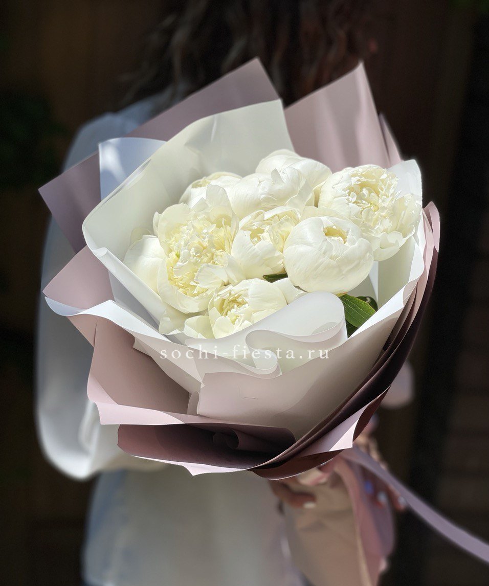 Девять белых пионов с пышными бутонами образуют монохромную композицию. Чистота линий и сдержанная упаковка подчёркивают природную красоту цветов.