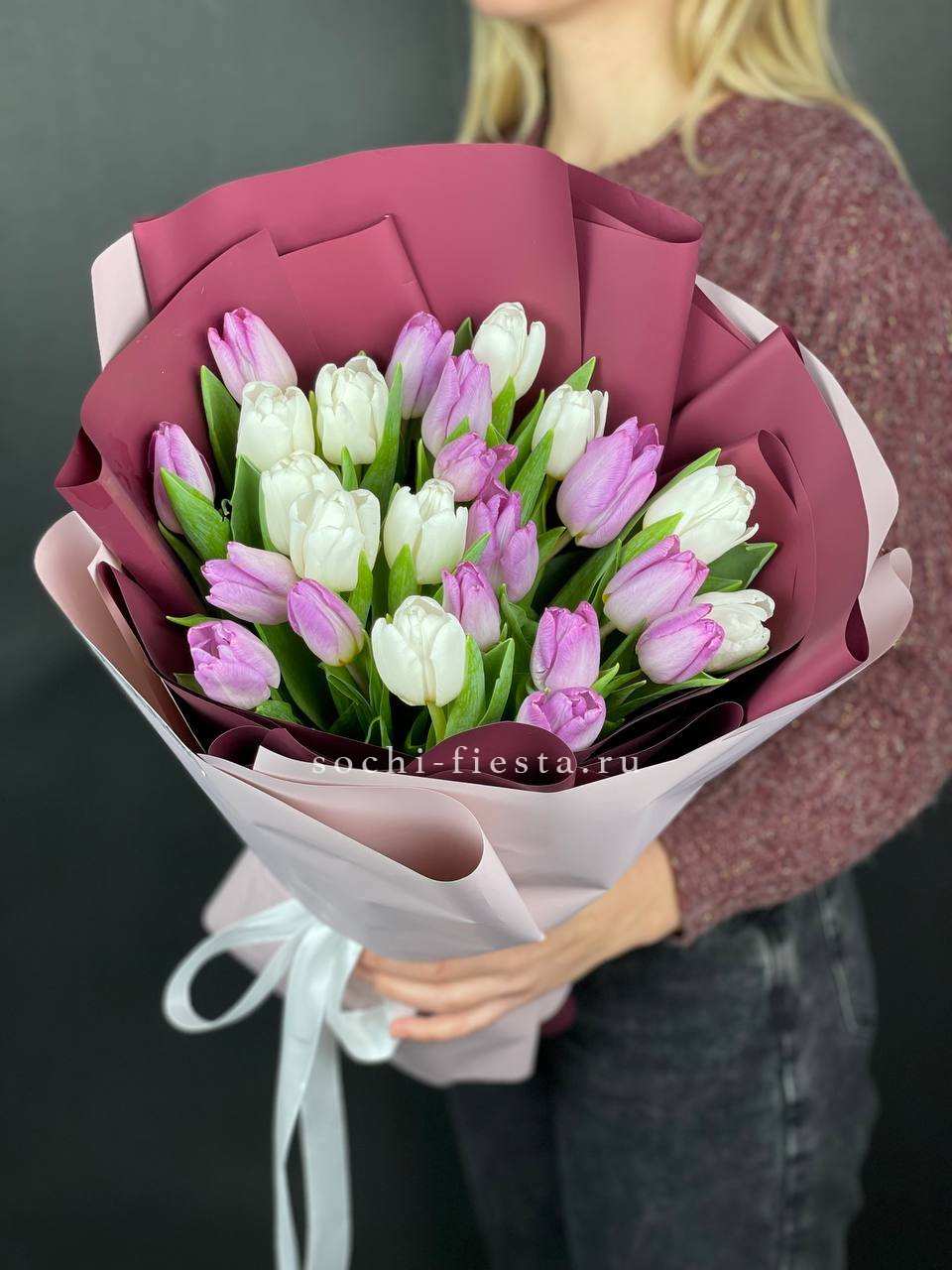 25 тюльпанов, лента, комбинированное оформление.