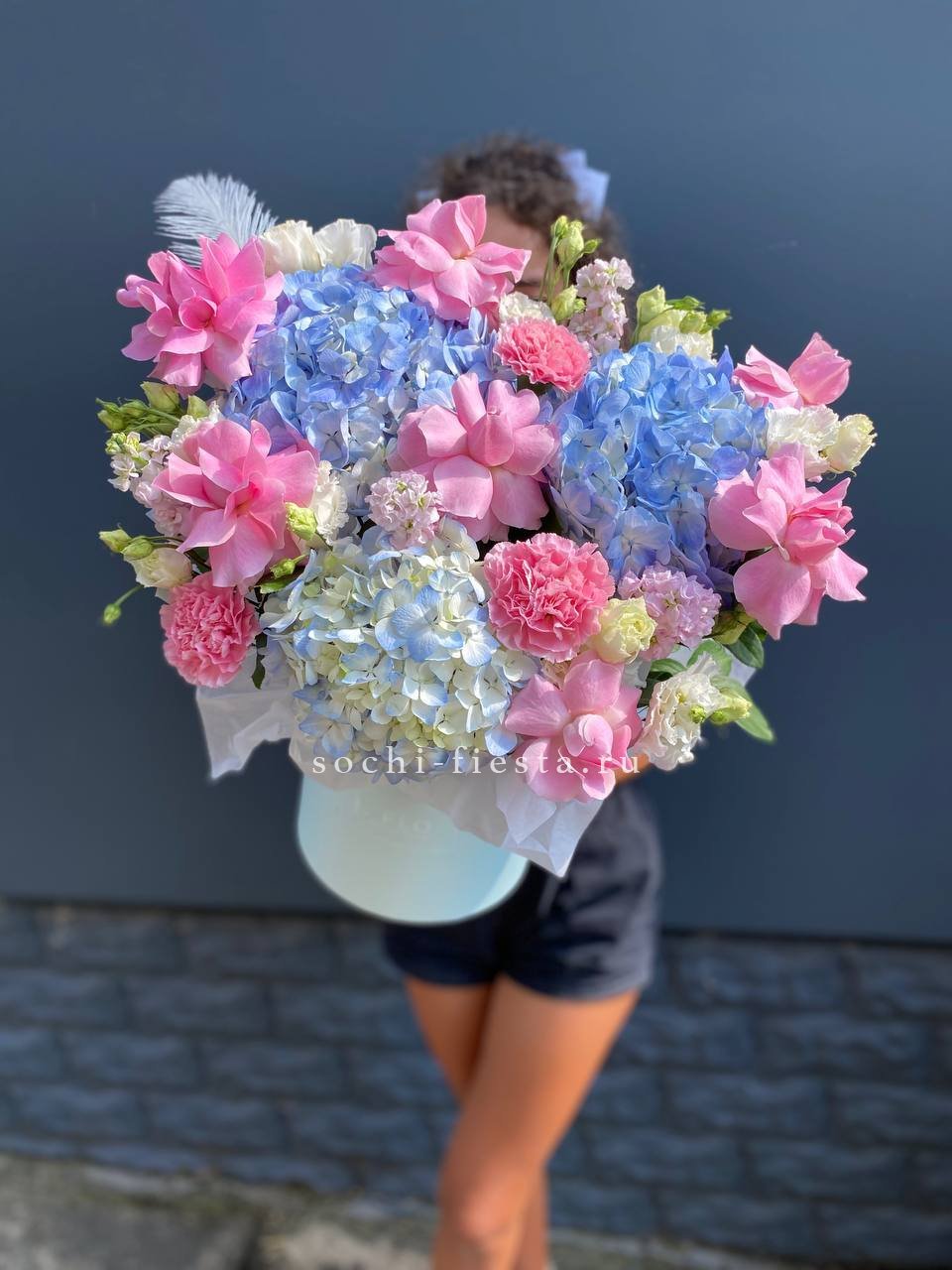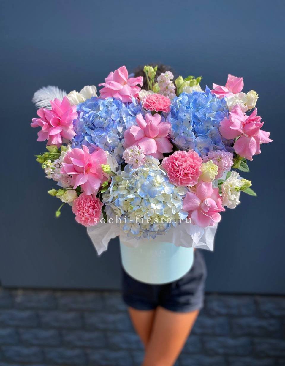 Воздушная композиция собрана из гортензии, роз, эустомы и гербер в голубых и белых оттенках. Бруния и эвкалипт добавляют объём, а аспарагус создаёт лёгкую дымку вокруг цветов. Букет хорошо держит форму и долго сохраняет свежесть.