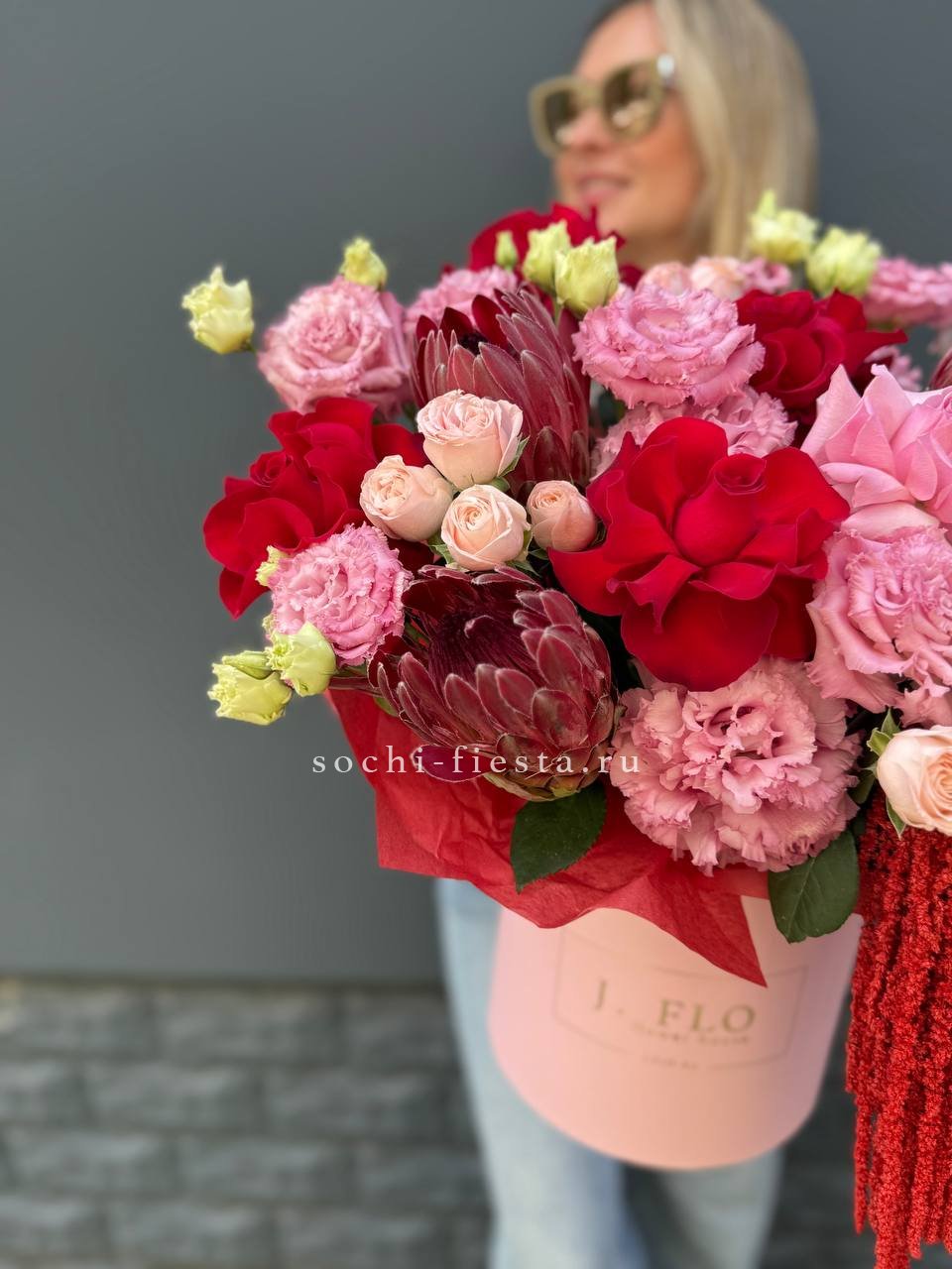 розы, протея, кустовые розы, эустома, амарант, цилиндр D20.
