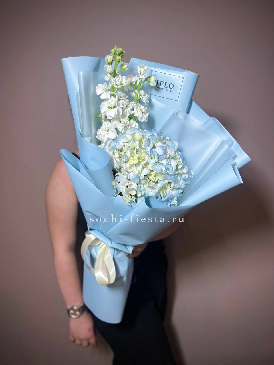 голубая гортензия, маттиола или замена в голубом оформлении.
