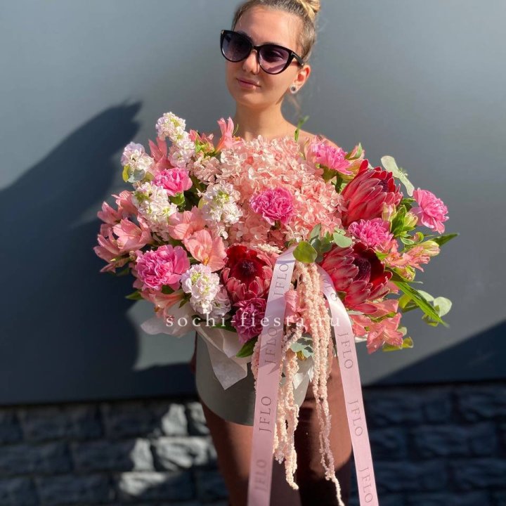 Наполнение подбирается под сезон. Зимой — амариллис, розы, ранункулюсы. Весной — тюльпаны, ранункулюсы, фрезия. Летом — пионы в мае-июне, гортензия в июле-августе. Осенью — хризантемы и декоративные травы.