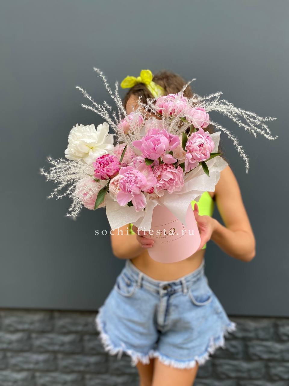 Пятнадцать пионов поднимаются над пушистыми метелками пампасной травы. Округлые бутоны контрастируют с воздушной текстурой злака. Композиция выглядит объемно при компактном основании.