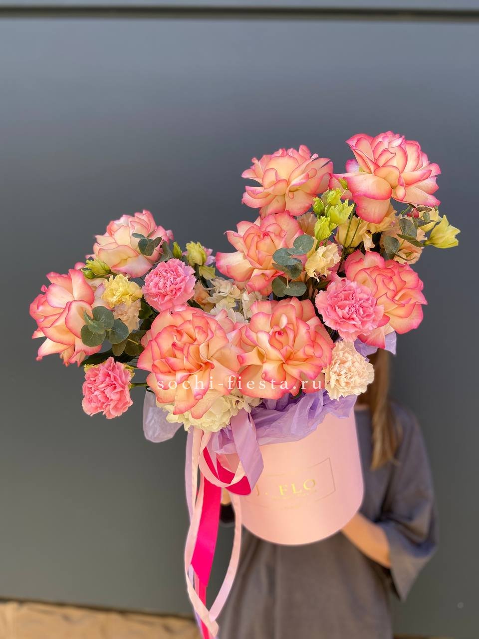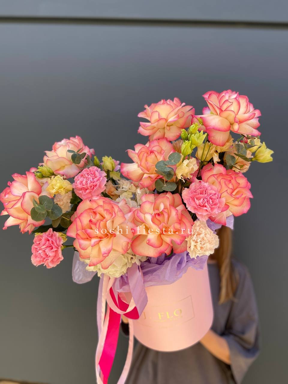 гортензия, эустома, диантусы, розы, эвкалипт и прочие цветы, гармонирующие по фактуре. Цветочная композиция в белых, нежно-сиреневых, розовых тонах в квадратном боксе D25.