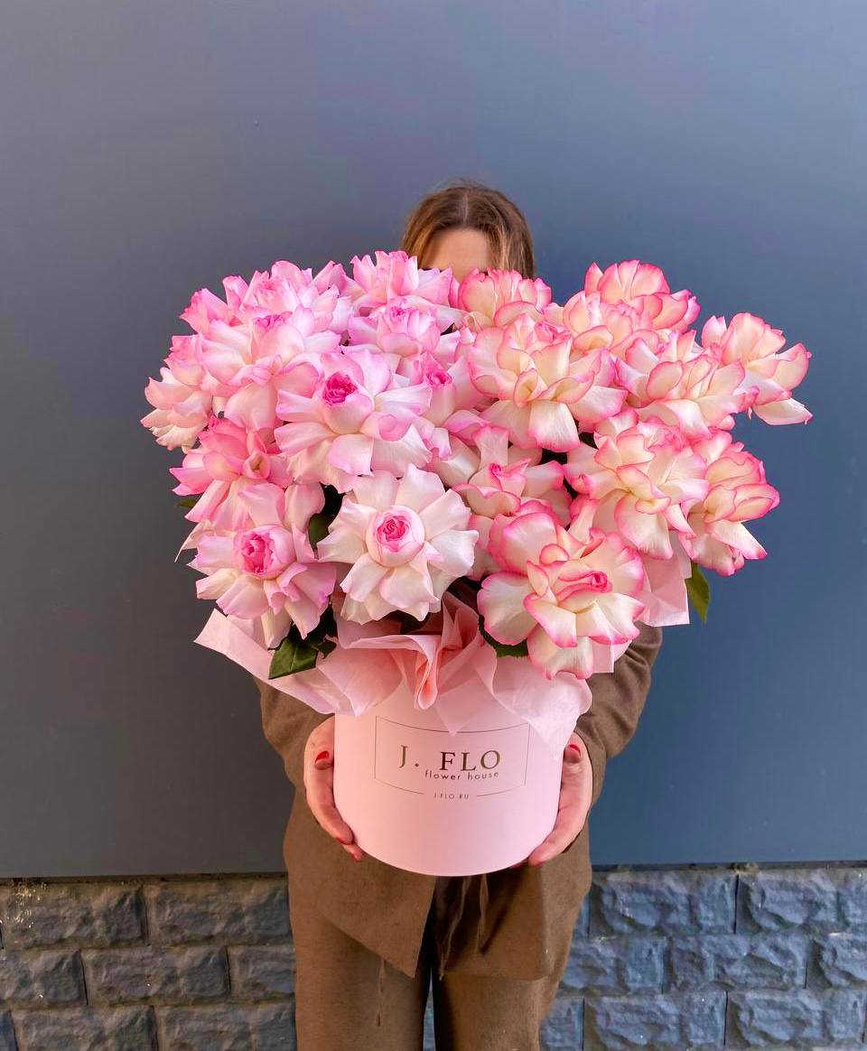 Пионовидная роза Бомбастик образует плотные бутоны с множеством лепестков. Эвкалипт добавляет свежести и завершает форму. Компактная коробка удобна для передачи из рук в руки.