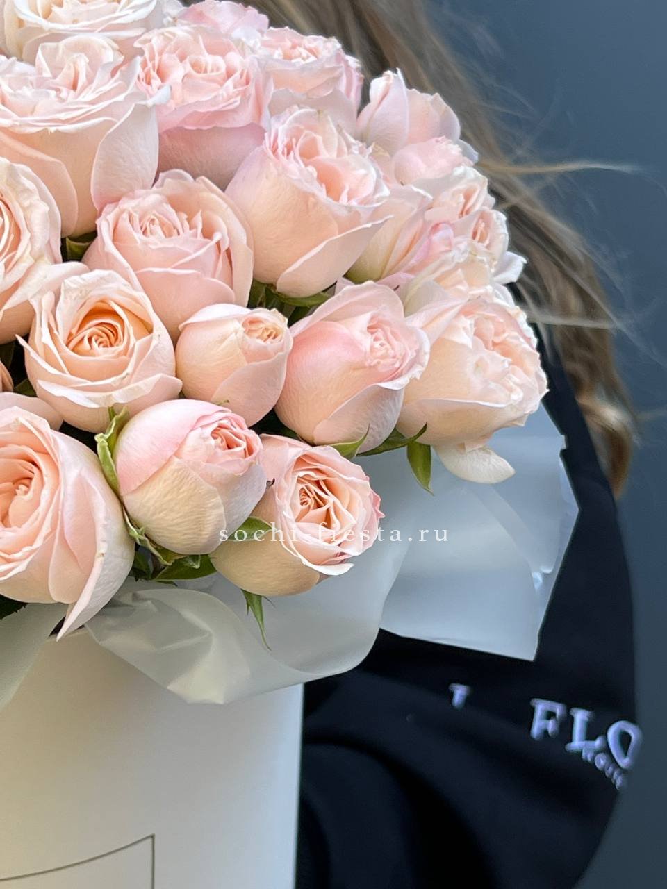 пионовидная кустовая роза бомбастик - 31 веточек, эвкалипт, лента, цилиндр D20.
