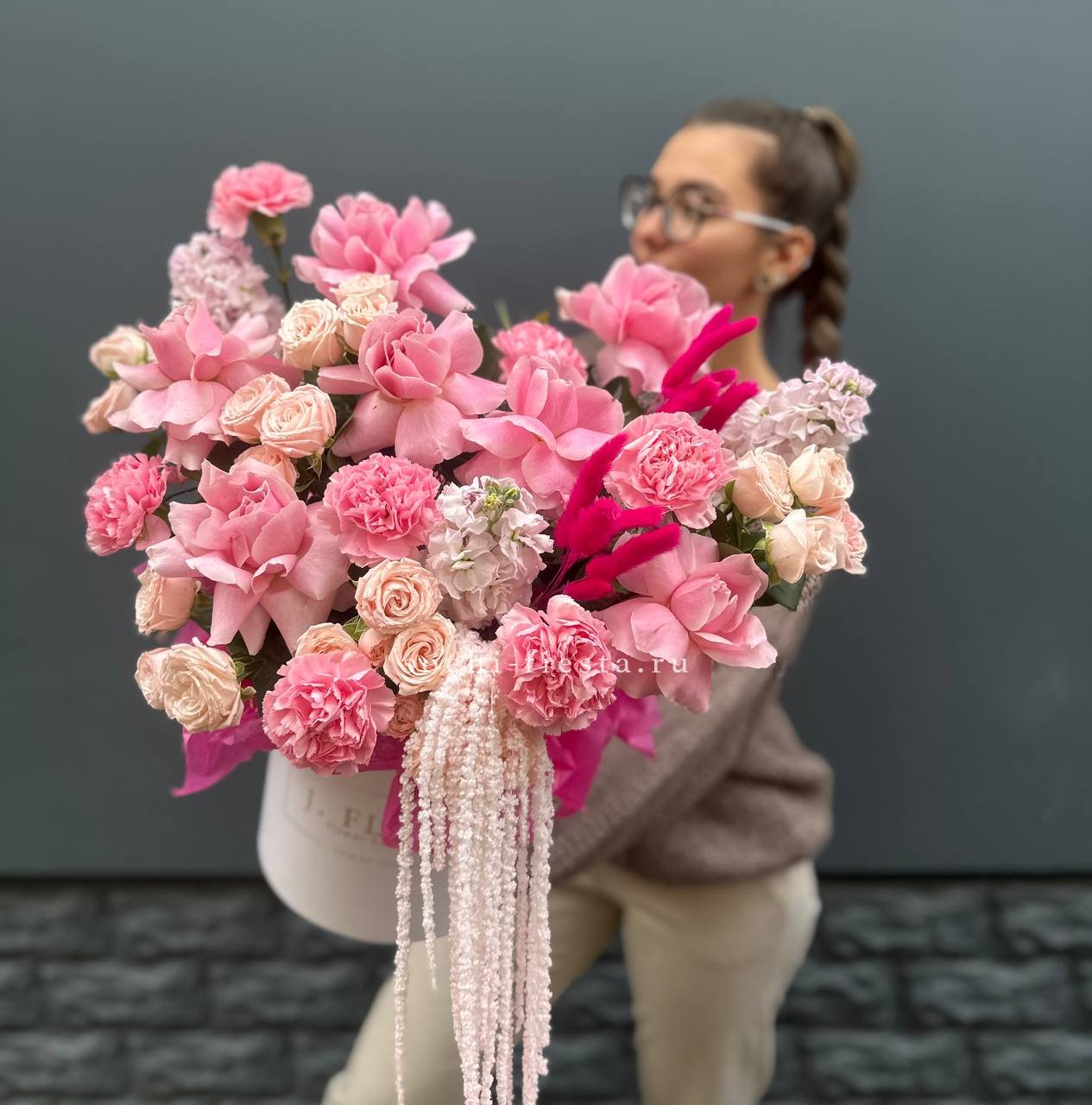 французские розы, кустовые розы, диантусы, матиолла, лагурус, цилиндр D20,  бумага тишью.