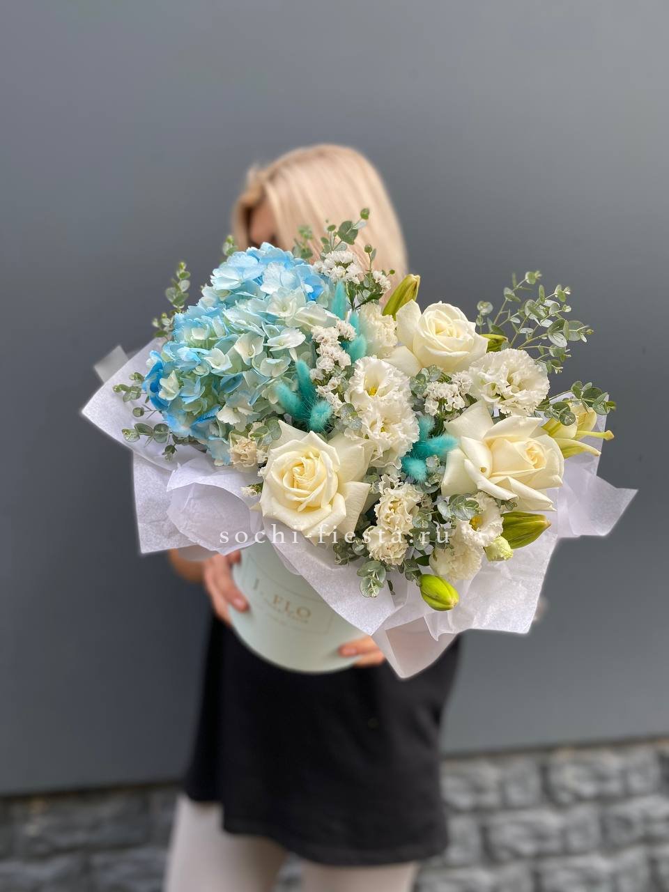 выполнен из эустом, французских роз, эвкалипт, цилиндр D20.