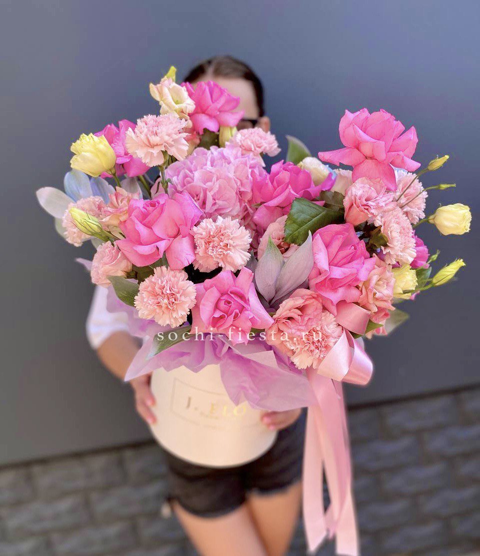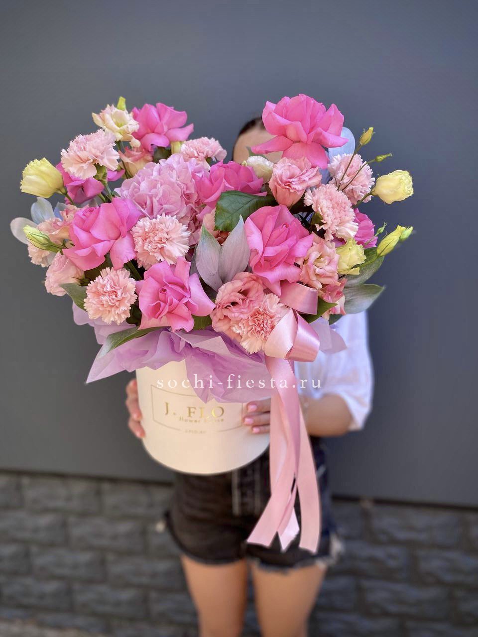 Воздушная гортензия встречается с плотными бутонами французских роз и миниатюрными диантусами. Эустома добавляет объема, а эвкалипт создает свежую основу для всей композиции в цилиндре.