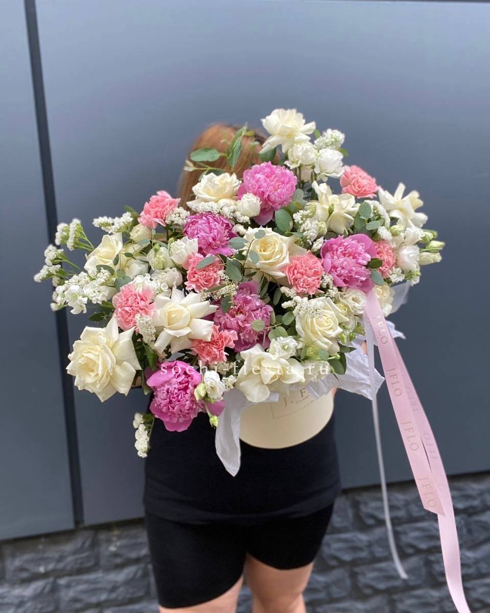 Пионы раскрываются пышными головками, окружённые воздушной статицей и многослойной эустомой. Маттиола вносит лёгкую небрежность, а диантусы расставляют яркие точки в общей картине.