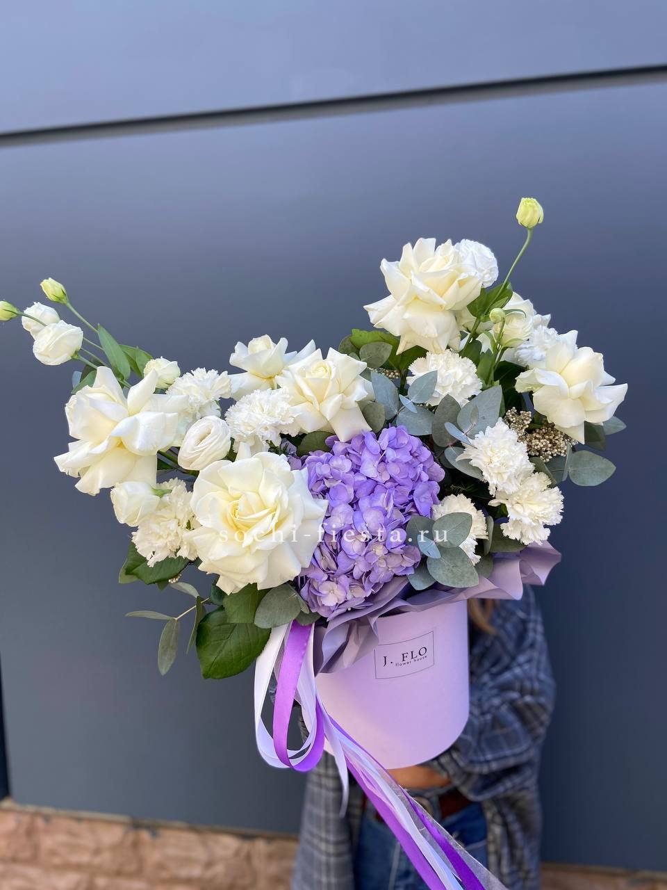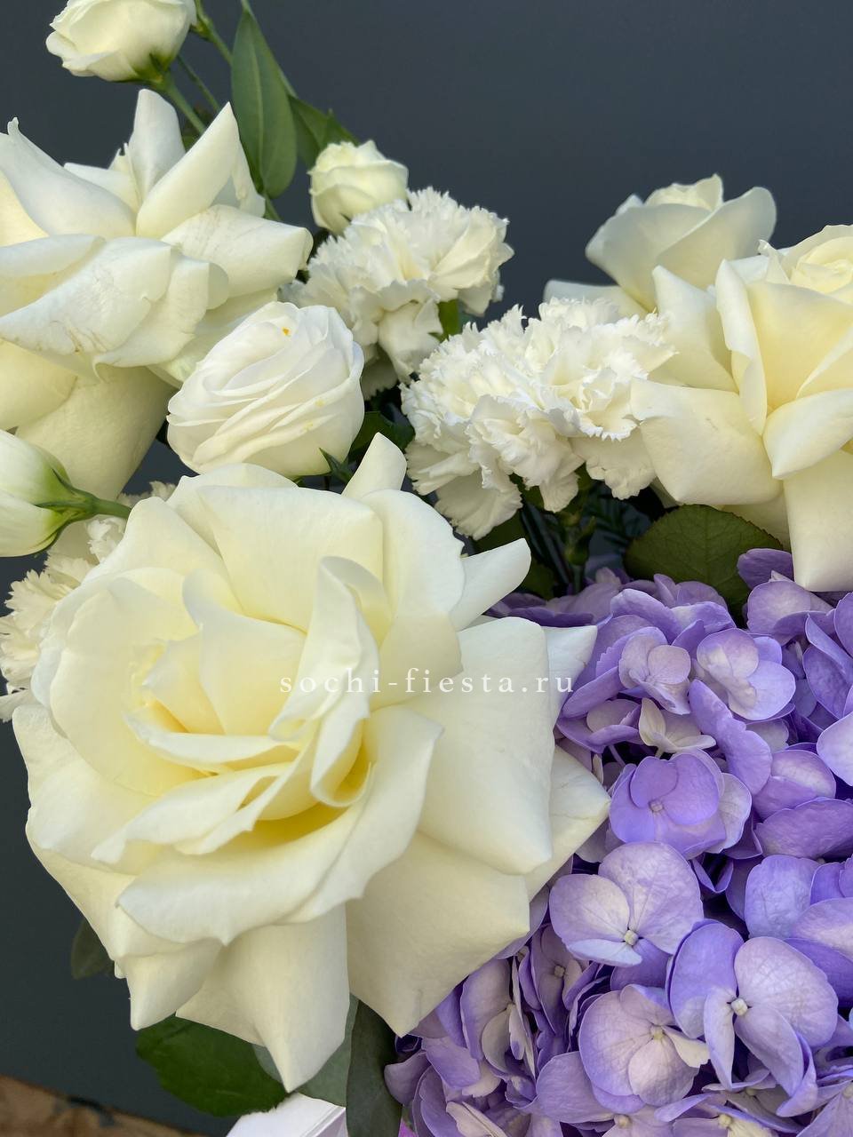 пионовидная кустовая роза, гортензия, одноголовая роза, эустома, бавардия, бокс D20.