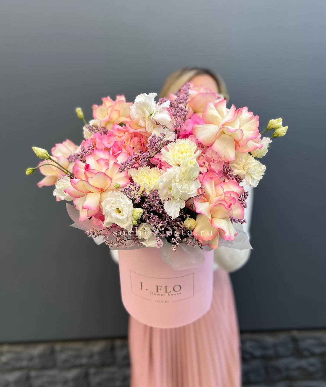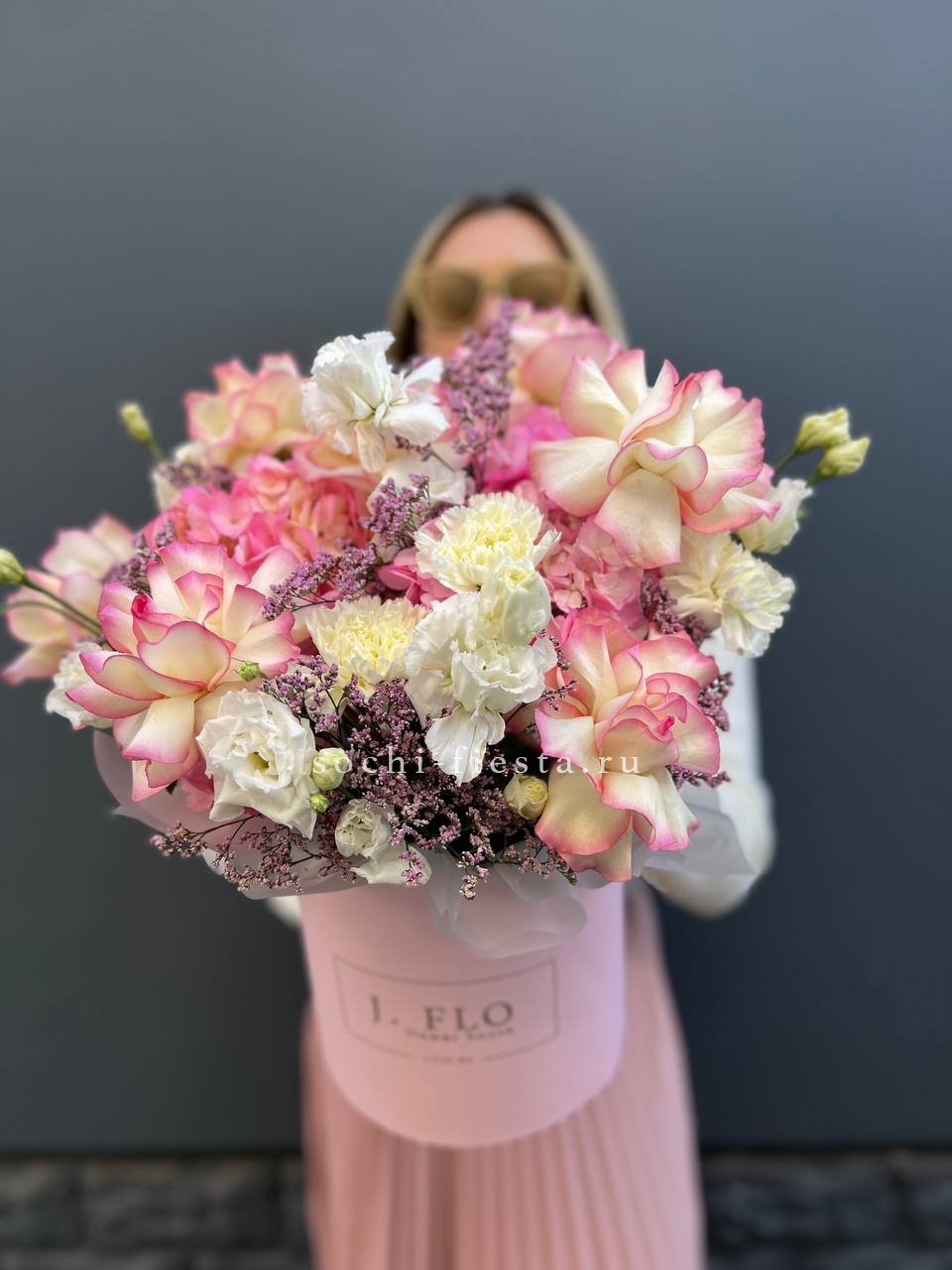 гортензия, розы пионовидные кустовые, эустома, эвкалипт, хамелациум, бруния, белая роза, цилиндр D16.