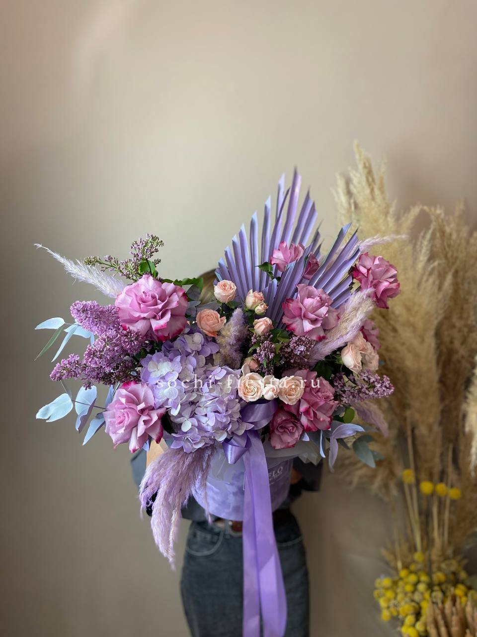 Розовые розы и сирень с гортензией собраны в свободную композицию с эвкалиптом и картадерией. Цилиндр фиксирует форму и дает цветам дышать без лишней плотности.