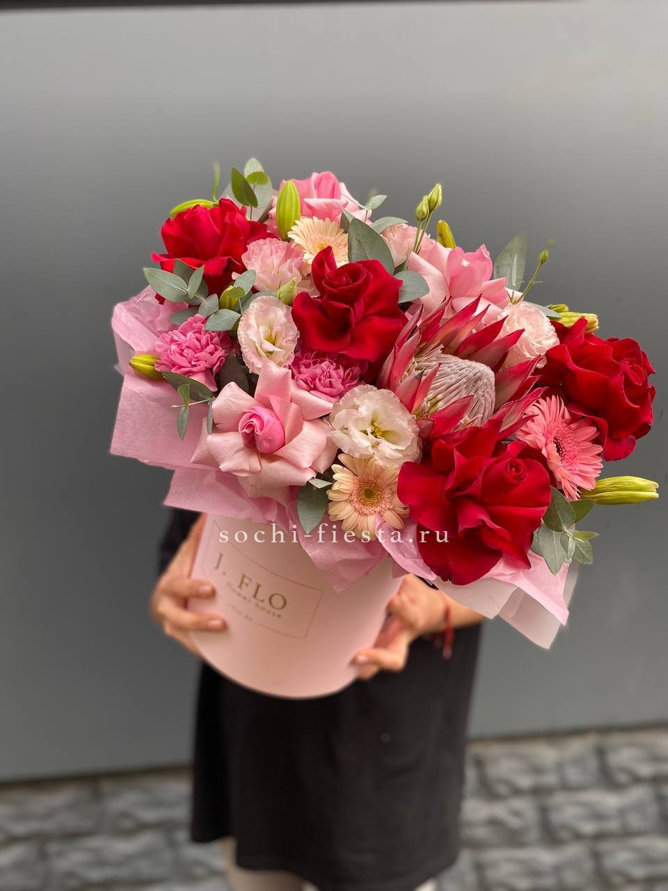 розы, протея, диантус, гербера, эустома, лилия, бокс 20.