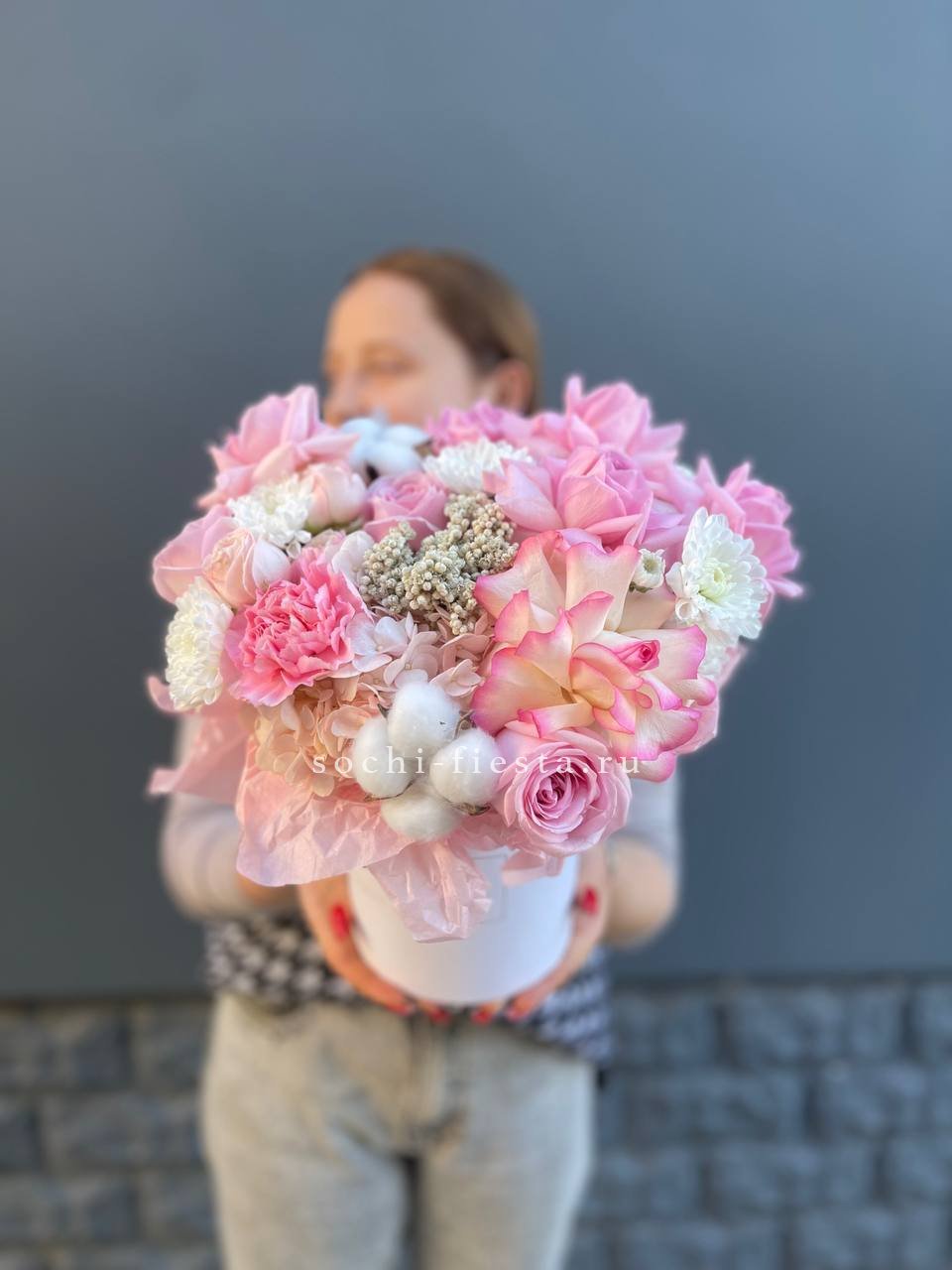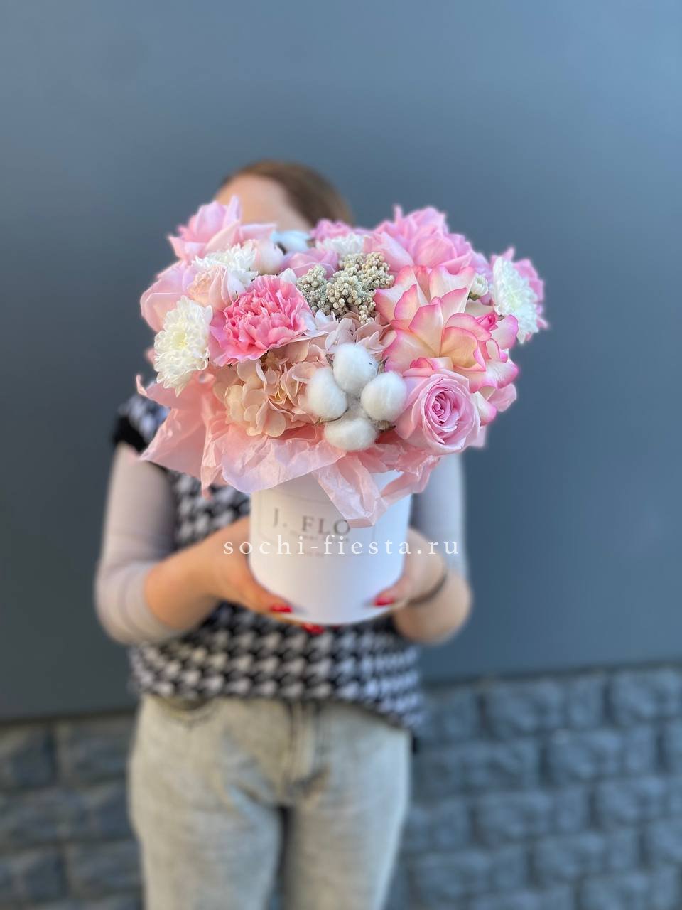 сборный нежный бокс из хризантемы, хлопка, герберы и эустомы.