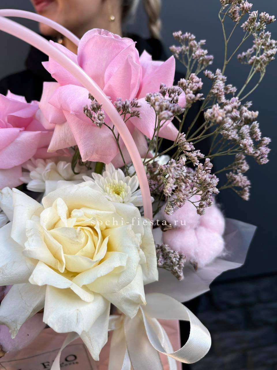 Белые и розовые розы образуют воздушную композицию с мягкими коробочками хлопка и лимониумом. Сумка-кашпо Sofi держит форму и позволяет разместить цветы на столе или полке. Букет выглядит аккуратно и остается свежим долгое время.