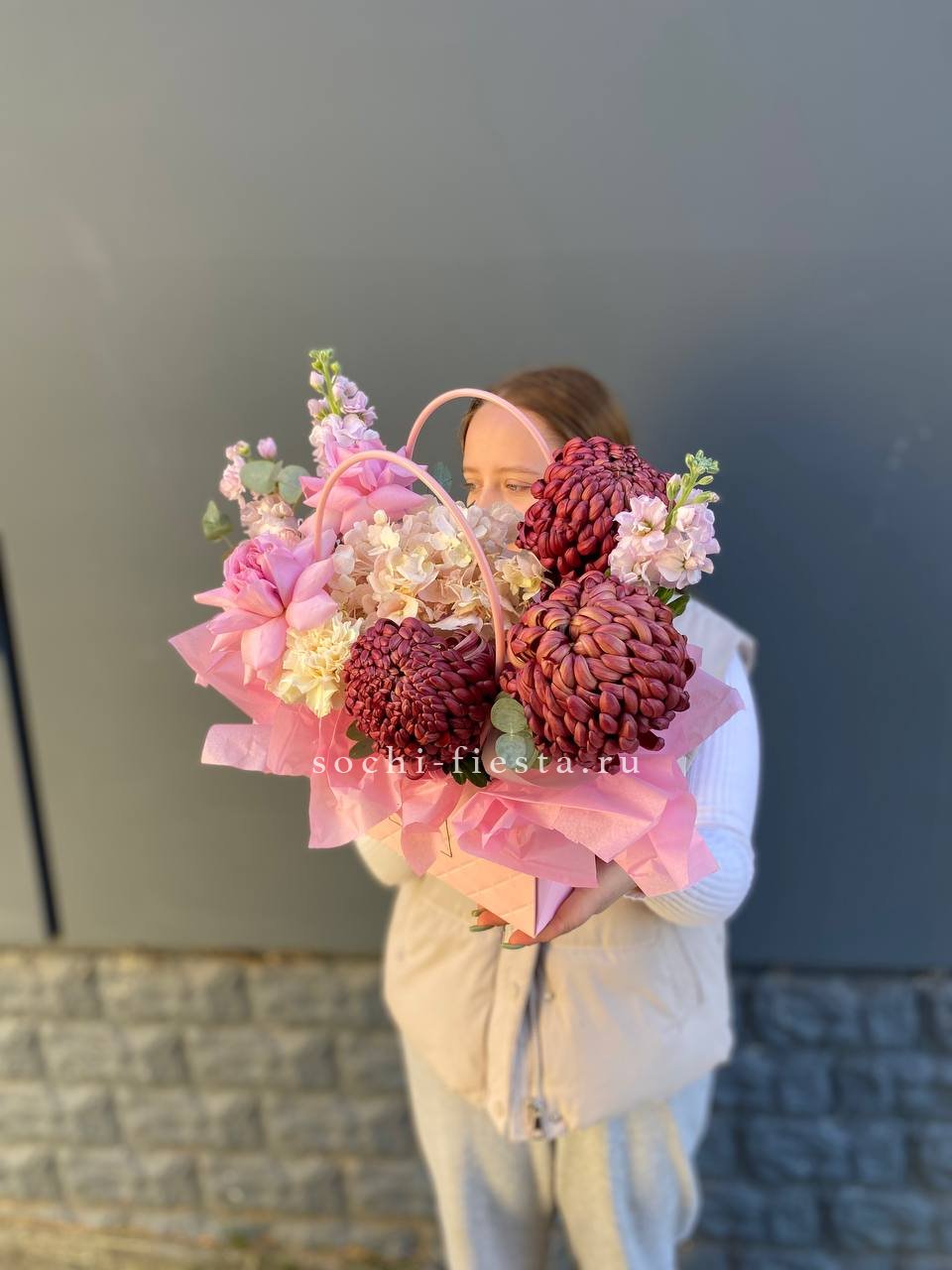 Композиция в сумочке собрана из розовых роз, гортензии и маттиолы с добавлением декоративных бигуди. Мягкая палитра и необычные детали создают легкое романтичное впечатление.
