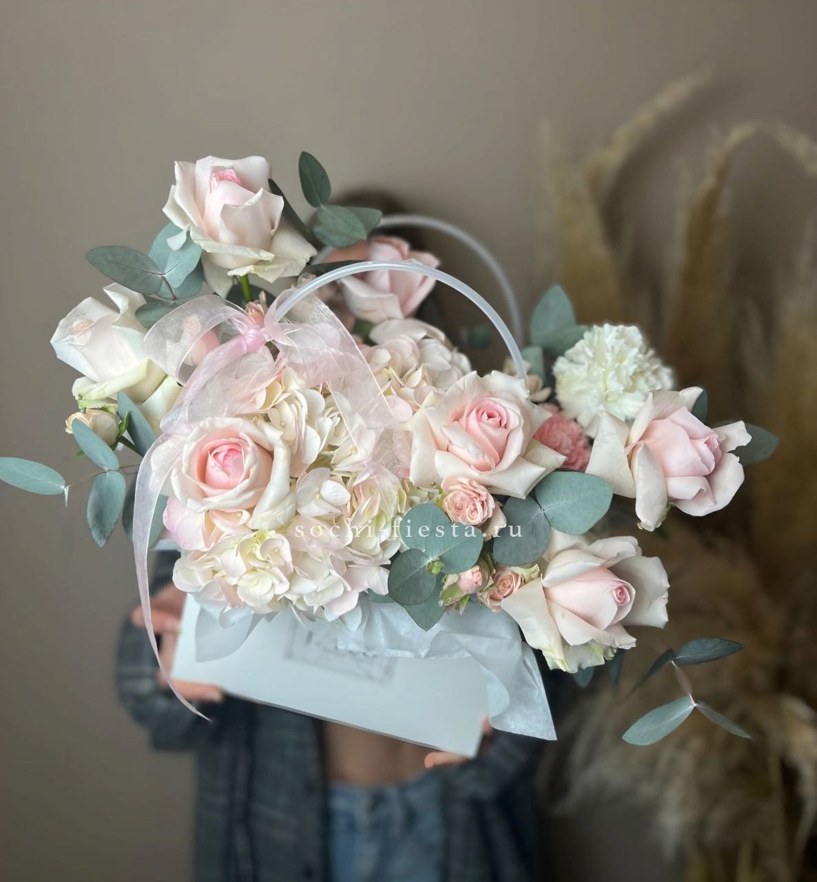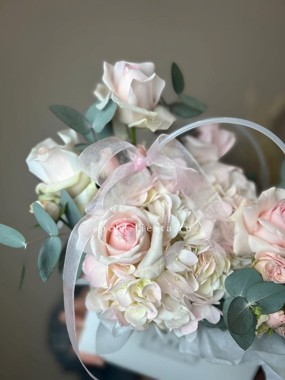 Классическая сумочка с розами в лаконичном исполнении. Эвкалипт обрамляет бутоны серебристой зеленью. Компактная форма подходит для любого интерьера и события.