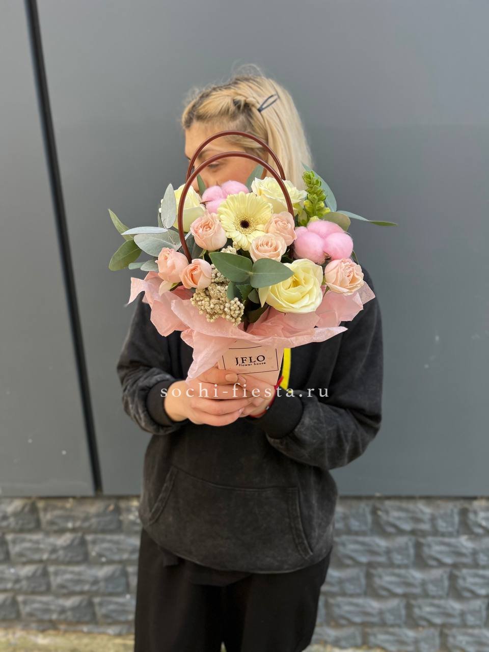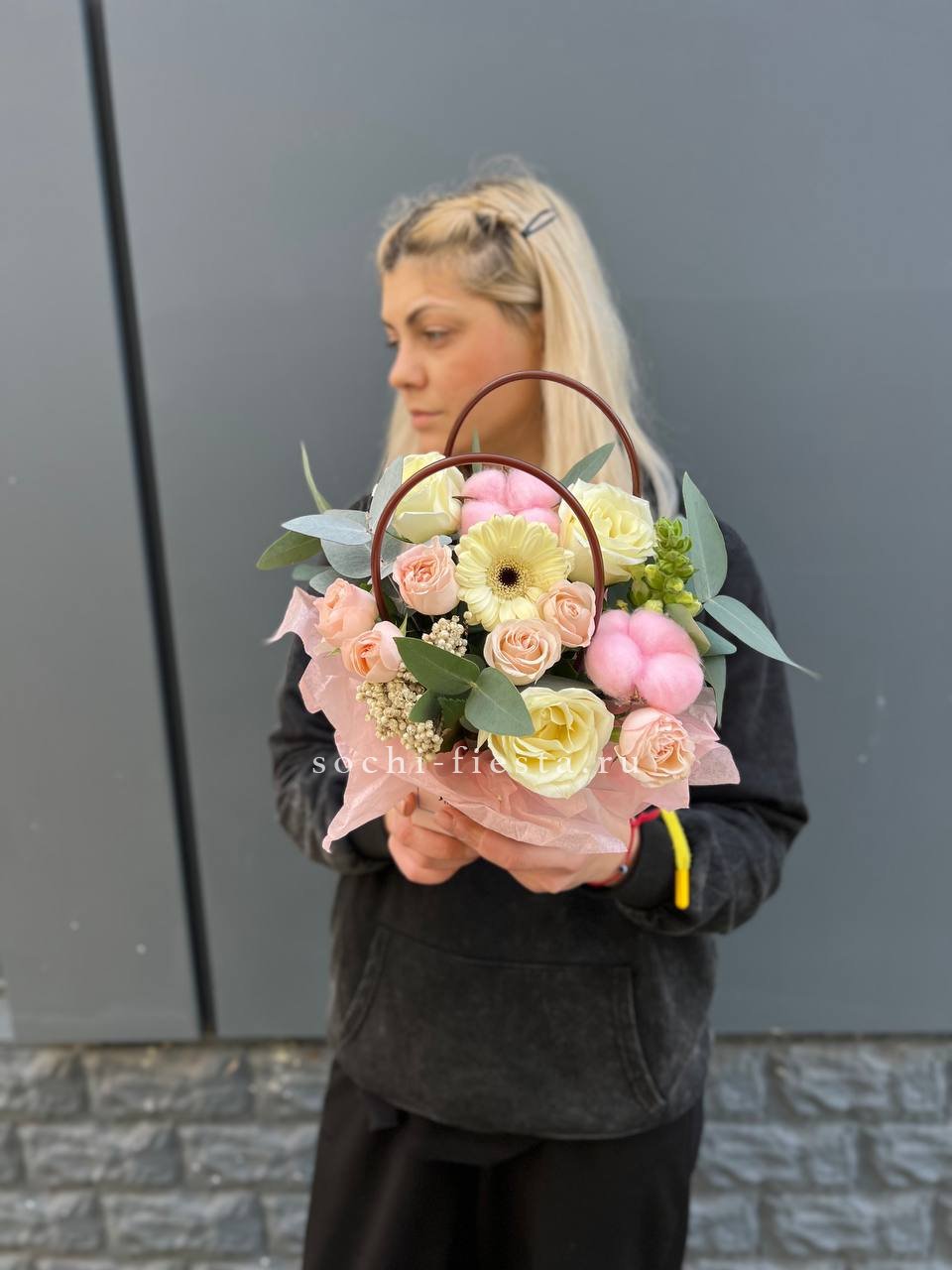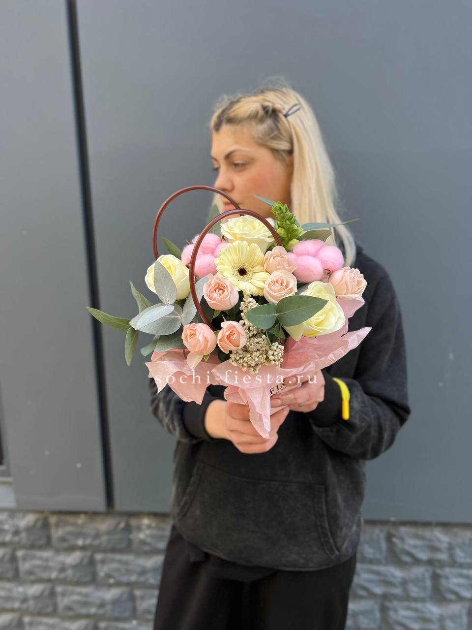Эустома и бомбастик с хлопком размещены так что композиция выглядит легко и не занимает много места. Такая сумочка удобна для подарка в руки и долго сохраняет свежесть.