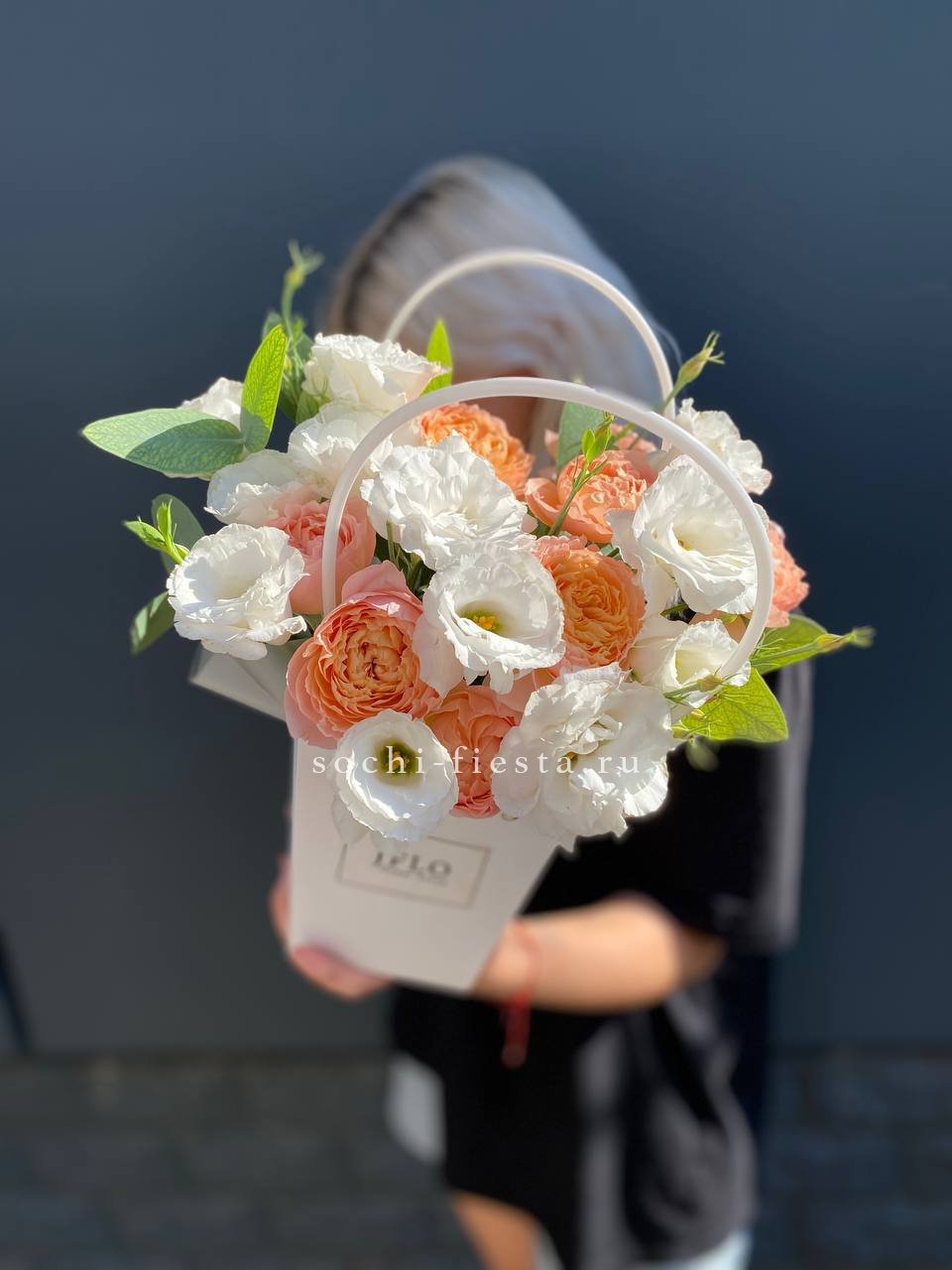 Пионовидные розы раскрываются пышными шапками рядом с воздушными соцветиями эустомы. Компактная форма сумочки удобна для вручения и не требует поиска вазы.