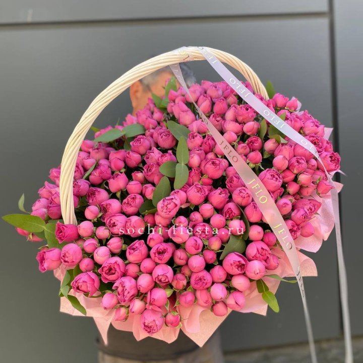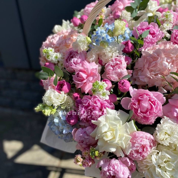 Состав корзин в Калининграде определяется текущими поставками и сезоном. Розы Freedom, Mondial, Cappuccino — для классических куполообразных аранжировок. Пионы в мае-июне из свежих поставок: Sarah Bernhardt, Red Charm, Bowl of Cream — главный сезонный продукт. Хризантема, альстромерия, гербера — для объёмных торжественных наполнений. Эустома, ранункули — для садовых корзин. Флорист строит состав под конкретный запрос.