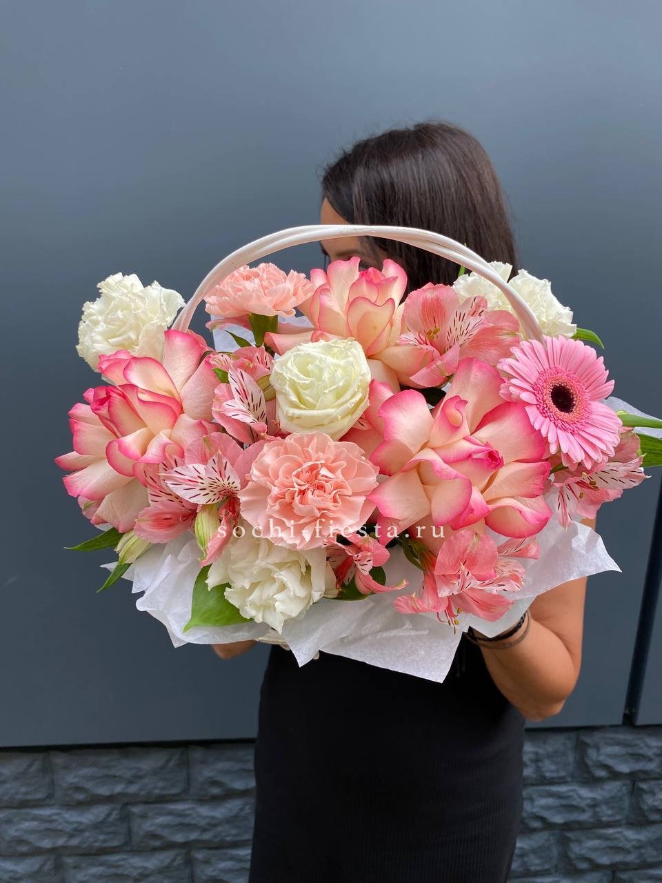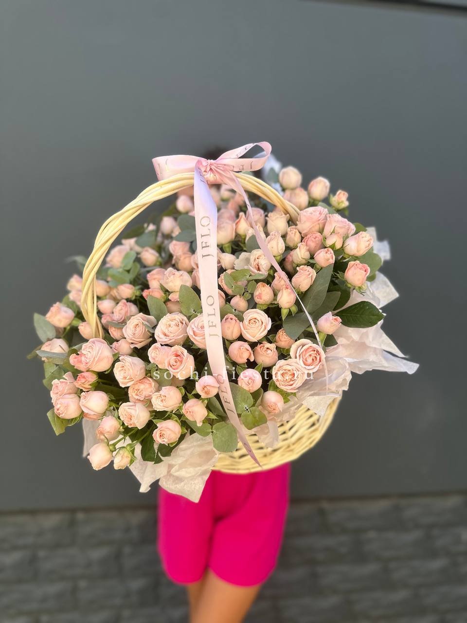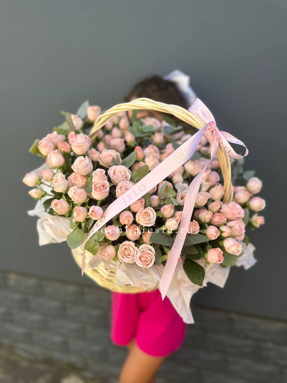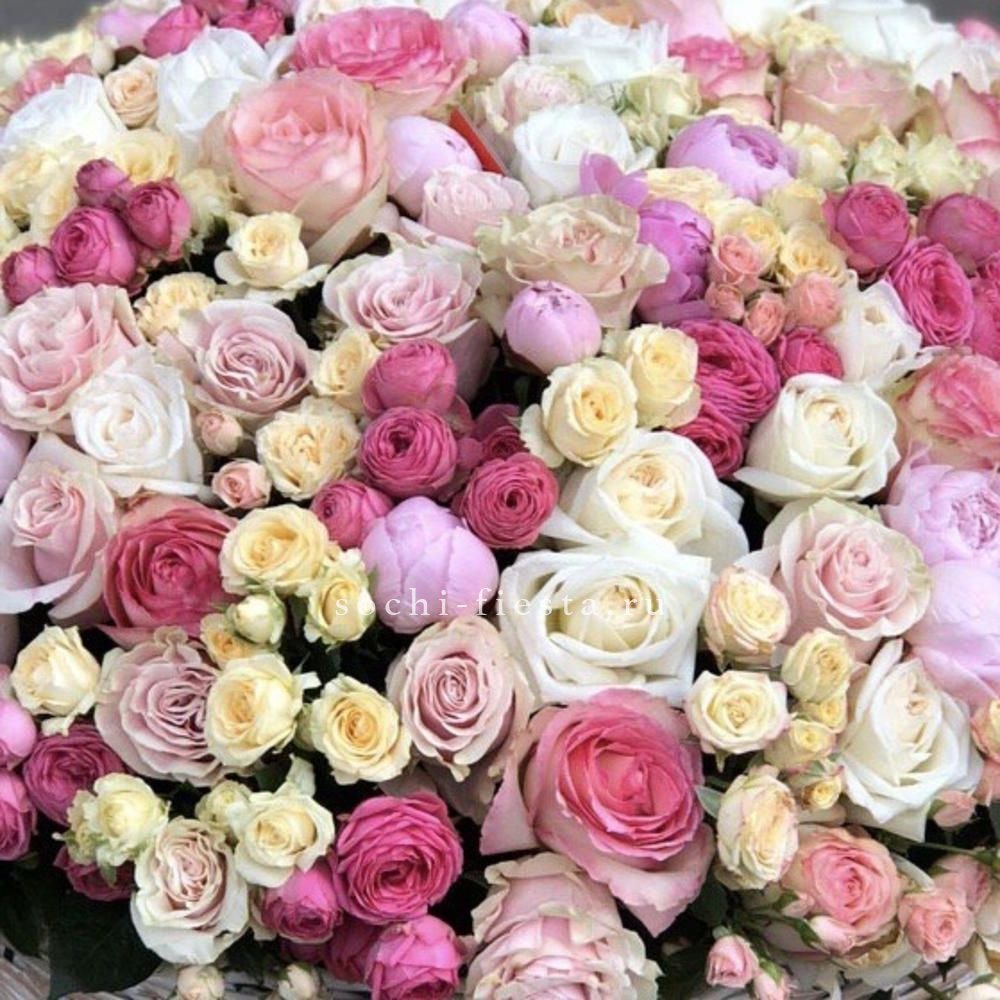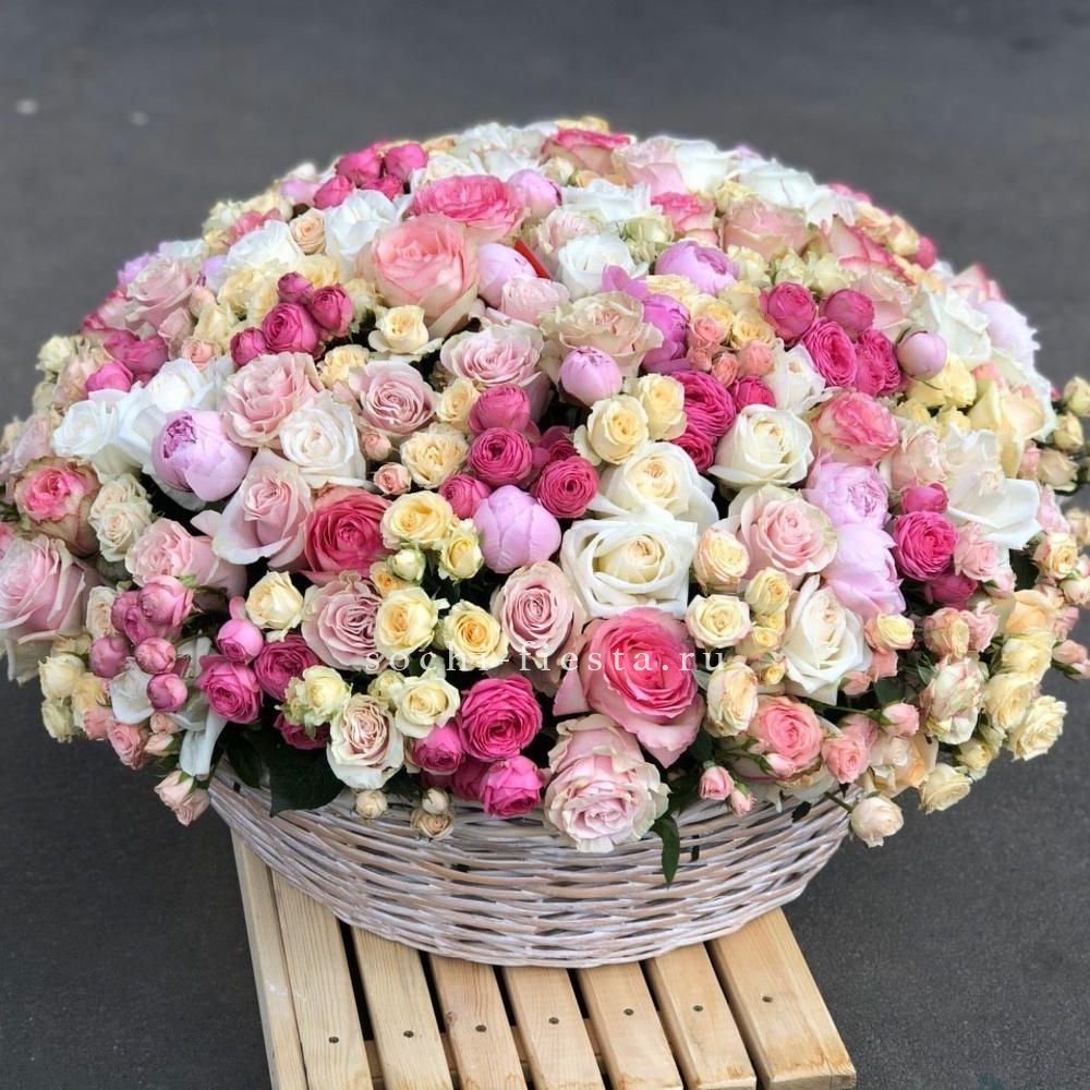 Корзина вмещает двести один бутон, образующих пышное цветочное полотно. Классическая форма подачи позволяет разместить композицию в любом пространстве без необходимости искать вазу. Впечатляющий объем для важных событий.