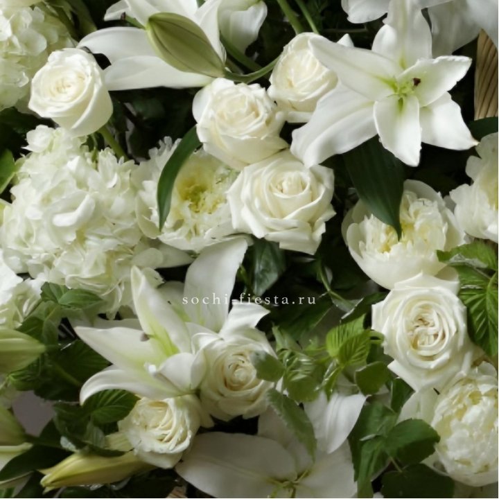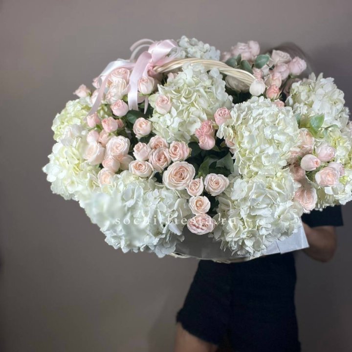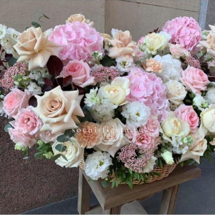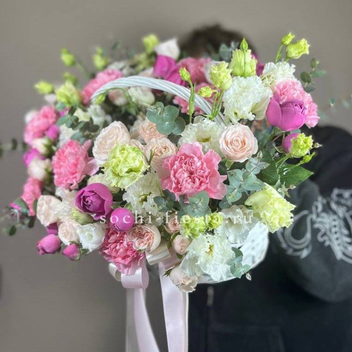 Состав корзин в Калининграде определяется текущими поставками и сезоном. Розы Freedom, Mondial, Cappuccino — для классических куполообразных аранжировок. Пионы в мае-июне из свежих поставок: Sarah Bernhardt, Red Charm, Bowl of Cream — главный сезонный продукт. Хризантема, альстромерия, гербера — для объёмных торжественных наполнений. Эустома, ранункули — для садовых корзин. Флорист строит состав под конкретный запрос.