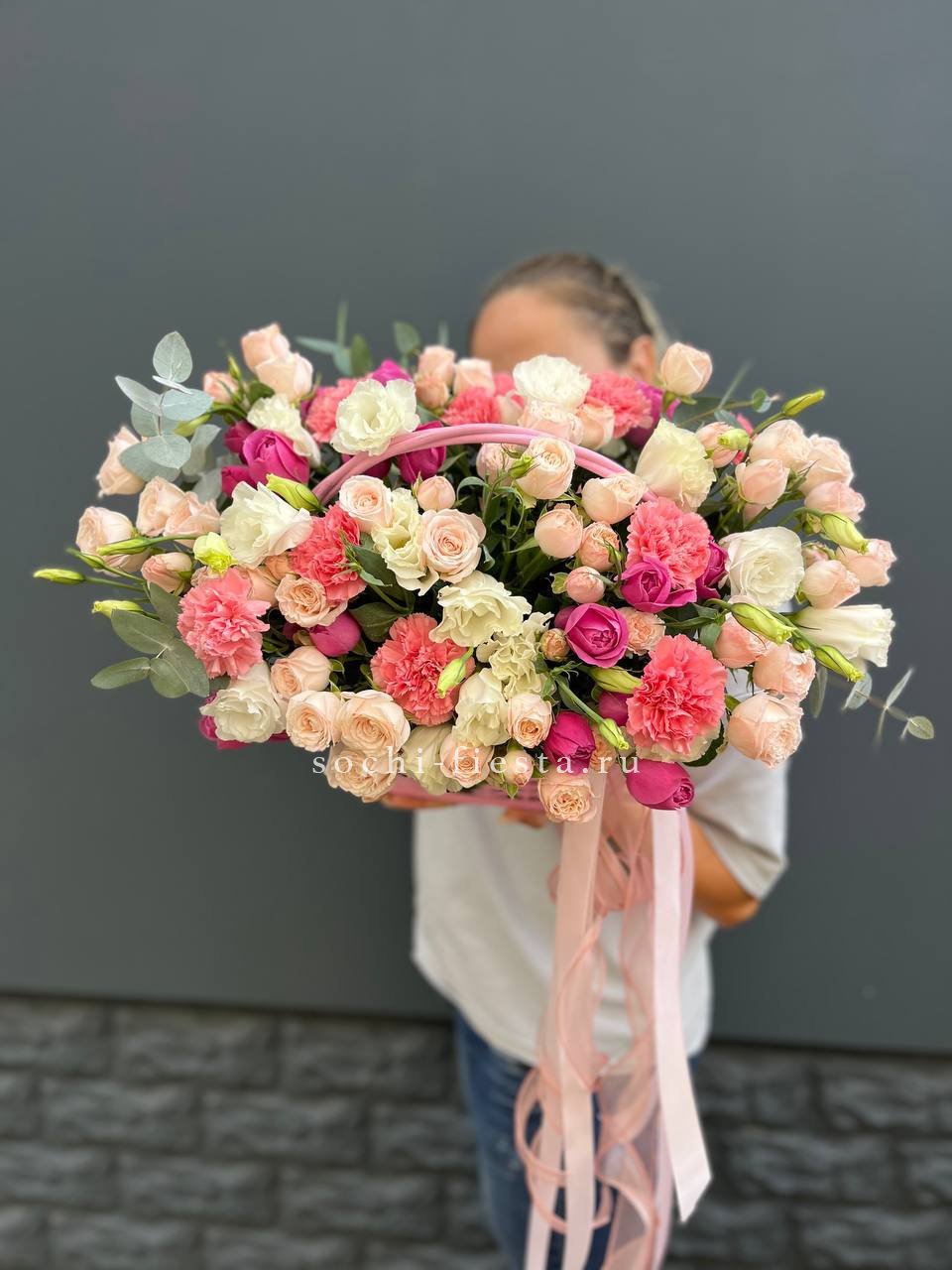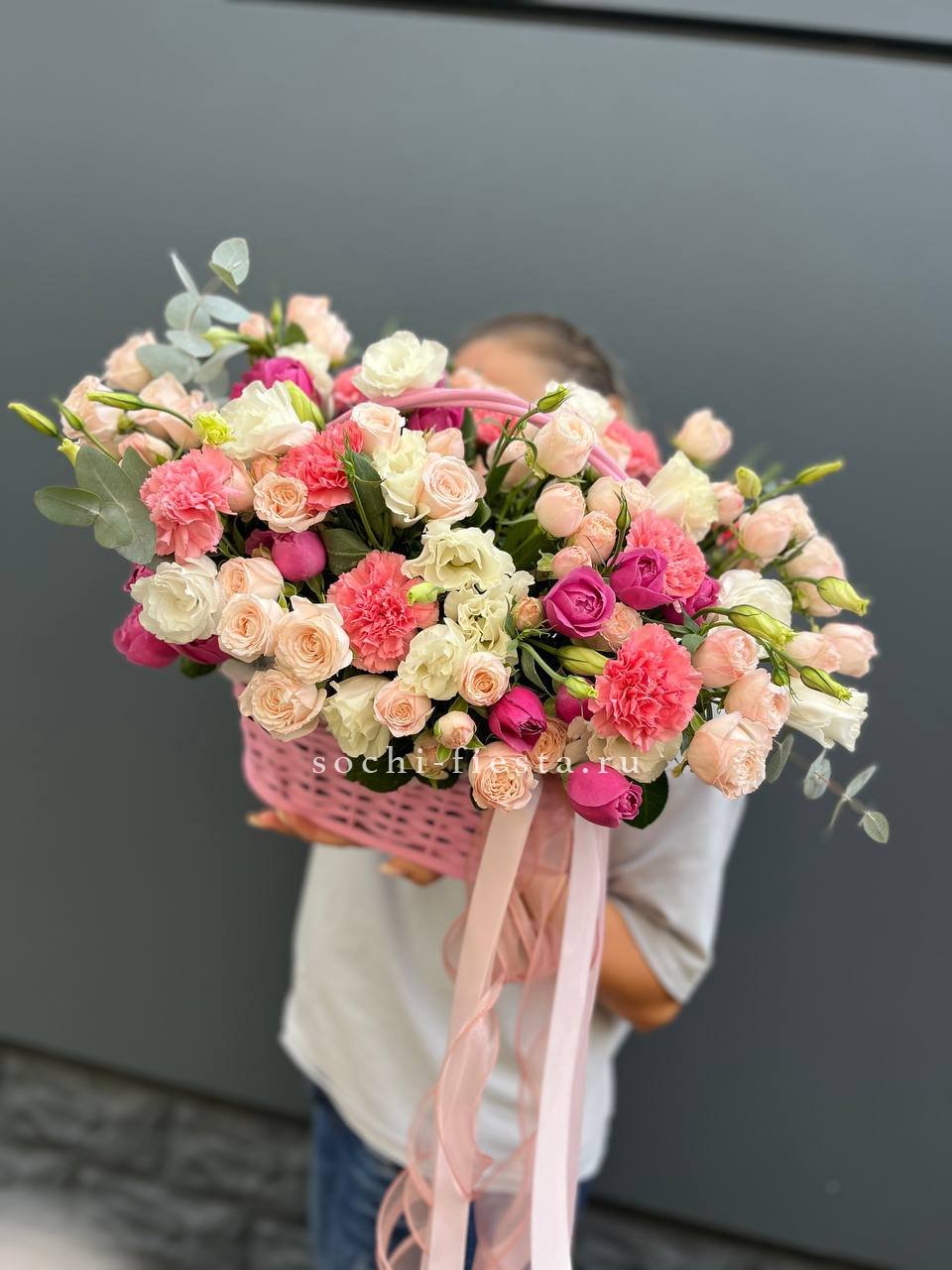 Плетёная корзина вмещает густую композицию из белых и розовых бутонов. Хризантемы и розы перемежаются с соцветиями гортензии, а статица добавляет воздушности между крупными головками цветов.