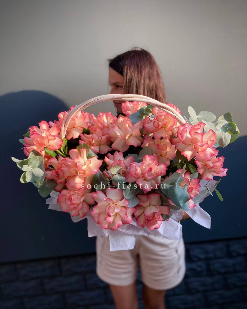 хризантема, кустовая роза, гортензия, белая роза, антиринум, статица, корзина средняя.